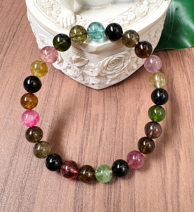 ~初めに~ ABOUTの内容をお読み頂きよく確認してからご購入下さいませ。 ※すべての商品に片山自ら氣入れをしてお届けします。 ※発送は、通常ご購入(ご決済完了)の翌日から数えて、木、土、日、祝日を除く7~10日位です。 最高級!高パワー! さまざまな色合いを持つミックストルマリンのブレスレットを入荷しました。 恋愛、健康、霊的才能や美的才能の開花、全地球的な愛を育むなど、その人の目指すところを確実にサポートしてくれるとされます。 電気を発する性質が強いトルマリンは、理屈抜きに「ニンゲン」に働きかけるパワーがあるとも言えます。 1点もの!次回入荷未定!お早めにどうぞ! 【ピンクトルマリン】 赤色~ピンク色のトルマリンは、恋愛に関する運気を向上させてくれる「愛の石」として人気です。 愛情表現が苦手な人には、異性の前でも素直に自分を表現する力になってくれると言われています。 【グリーントルマリン】 鮮やかなライトグリーンや、深い森林のような緑色などのグリーン系のトルマリンはヒーリングストーンとして人気があります。 自然を感じさせる色合いが心をリラックスさせてくれ、肩の力を抜いて自然体な自分を取り戻すことができると言われています。 【ブラックトルマリン】 魔除けやネガティブエネルギーからの防御、対人トラブルから身を守るお守り 【トルマリン意味・効果】 ・思いやりの心を育てる ・エネルギーの変換機 ・心身や環境エネルギーの浄化と純化 ・心に活力と勇気を与える ・エネルギーの活性化 ・環境的エネルギーや他人の感情に巻き込まれない ・内分泌系によく働きかけ身体の活性化をはかる ・のどの不調も改善する効果があるとされています 【仕様】 玉サイズ:約7.8~8.0mm 内径:約17cm ※純粋な天然石ですので多少の欠けやヒビが入っているものがございます。 ※天然石故加工品の場合、表面に小さな凹凸が存在する場合がございます。ご了承のうえご注文お願い致します。 ※色の具合や模様は変わります。 ※モニター環境によって多少の色の違いがありますことをご了承くださいませ。 260315