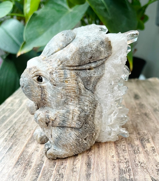 新着★豊かさを運ぶ!飛躍前進!★水晶クラスター★うさぎの彫刻置物
