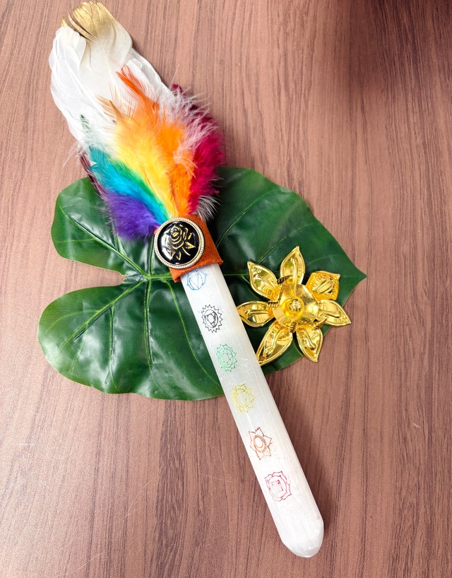 ~初めに~ ABOUTの内容をお読み頂きよく確認してからご購入下さいませ。 ※すべての商品に片山自ら氣入れをしてお届けします。 お買得品! 強力な浄化!チャクラの活性化! セレナイトに7チャクラのシンボルが描かれ、7色のチャクラカラーの羽がついたパワフルなワンド(台付)です。 ※一部チャクラシンボルにかすれやキズがある為、お買い得になっております。エネルギー的には問題ございませんが、予めご了承の上ご購入ください。 瞑想時に左手で持ったり、気になるチャクラに先端を当てたりしてヒーリングにご利用ください。 1点もの!次回入荷未定!お早めにどうぞ!! チャクラとはサンスクリット語で車輪を意味する言葉で、人間の生命や肉体・精神の働きをコントロールする重要なコントロールセンターです。 【セレナイト】 ギリシャ語の「月」セレニティ(Selenites)や、「月の女神セレーネ」(Selene)から名付けられたと言われています。別名「聖母マリアのガラス」とも呼ばれる神秘的な石です。和名は「透石膏(とうせっこう)」 夜空に浮かぶ月のような透明または半透明のホワイトやカラーレスで、すりガラスのように半分透き通り、光に当たれば美しいキャッツアイの輝きを放っています。 強力な浄化効果で人や空間を浄化したり、ヒーリング効果が高く、やさしさに包まれるような心の癒しや、心が軽くなり、負の感情を洗い流しポジティブ思考で人生を良い方へ導くとされています。 ・深い心の癒し ・感情のコントロール ・頑固な感情を和らげてくれる ・人や空間などの強力な浄化作用 ・マイナスエネルギーを洗い流す ・ポジティブに明るくなる ・人生を良い方向へ導く サイズ: 全長(羽部分も含む)約10cm×厚さ1.2cm前後 台座付き ※硬度が低く、水に弱いのでお取扱いにご注意ください。 ※純粋な天然石ですので多少の欠けやヒビが入っているものがございます。 ※天然石故加工品の場合、表面に小さな凹凸が存在する場合がございます。ご了承のうえご注文お願い致します。 ※色の具合や模様は変わります。 ※モニター環境によって多少の色の違いがありますことをご了承くださいませ。 251116