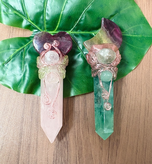 ~初めに~ ABOUTの内容をお読み頂きよく確認してからご購入下さいませ。 ※すべての商品に片山自ら氣入れをしてお届けします。 天然石を使用したパワーみなぎる魔法の杖、マジックミニワンドを入荷しました。 それぞれのワンドの上部にはフローライトのハートと月がついています。 杖や棒を意味する「ワンド」は、古来よりシャーマン、ヒーラーなどが、神聖な儀式やヒーリング、エネルギーワークに使用し、自分自身や他者へのあらゆるヒーリング、エネルギー調整やチャクラの活性化、ネガティブな思考パターンの手放し、心身の浄化、空間の浄化、天然石の浄化などの様々な場面で使われています。 ワンドは持っているだけでも石のエネルギーを受け取る事ができます。ワンドを左手に持ちながらの瞑想もおすすめです。 次回入荷未定!お早めにどうぞ! ※海外製品の為、制作過程において表面に小さな凹凸や小さなキズ、色ムラ、色味相違、ボンド跡などある場合がございます。予めご了承のうえご注文お願い致します。 ①ローズクォーツ 愛の石!恋愛運の定番クォーツ! 愛と美の女神アフロディーテに捧げられたバラから命名されています。 相手を癒やす力も大きく、 対人関係のトラブルから守る力も持っています。 愛の癒しエネルギーも素晴らしく 、愛だけでなく仕事・ 対人面・ 美容にまでエネルギーを注いでくれます。 内面も外面も美しくありたい方、自分自身を肯定し自分を大事にしたい方、優しさや思いやりの気持ちを高めたい方、過去の傷や失恋を乗り越え安心したい方、愛されやすい魅力を高めたい方におすすめです! ②フローライト 和名は「蛍石」。紫外線を当てると、自ら光る性質があるためです。 紫、緑をはじめ、青、黄、ピンクと非常に幅広いカラーリングは、「みんな違ってみんないい」の言葉がぴったりです。幅広いものの考えを導くとされ、行き詰まった事柄も解決への道をその光で照らし出すと言われます。落ち込む人には希望の光となり、かたくなな人には目を覚ます光となるとされます。 ≪フローライト意味合い≫ ネガティブな感情を解消、 頭の疲れ、 集中力,思考力UP、 自由を求める心を強める、 記憶力UP、 受験祈願 抑圧感情の解放、 無邪気な発想と思考、 物事をスムーズに運びたい方 【商品仕様】 サイズ:全長約10cm前後 ※海外製品の為、制作過程において表面に小さな凹凸や小さなキズ、色ムラ、色味相違、ボンド跡などある場合がございます。予めご了承のうえご注文お願い致します。 ※純粋な天然石ですので多少の欠けやヒビが入っているものがございます。 ※天然石故加工品の場合、表面に小さな凹凸が存在する場合がございます。ご了承のうえご注文お願い致します。 ※モニター環境によって多少の色の違いがありますことをご了承くださいませ。 251116