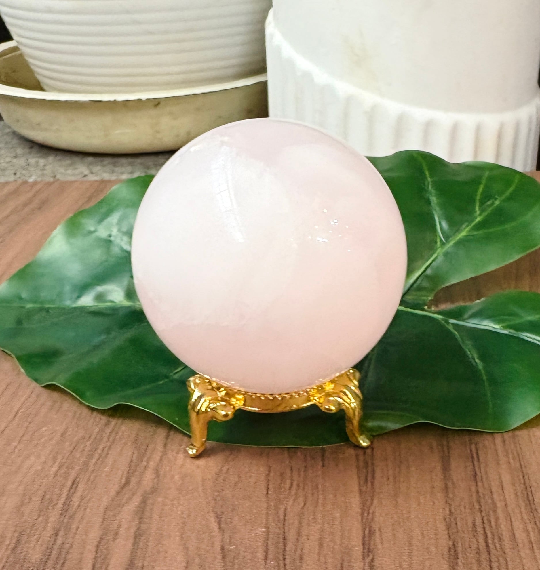 淡いミルキーピンクのかわいいピンクカルサイトの丸玉(台座付き)です。