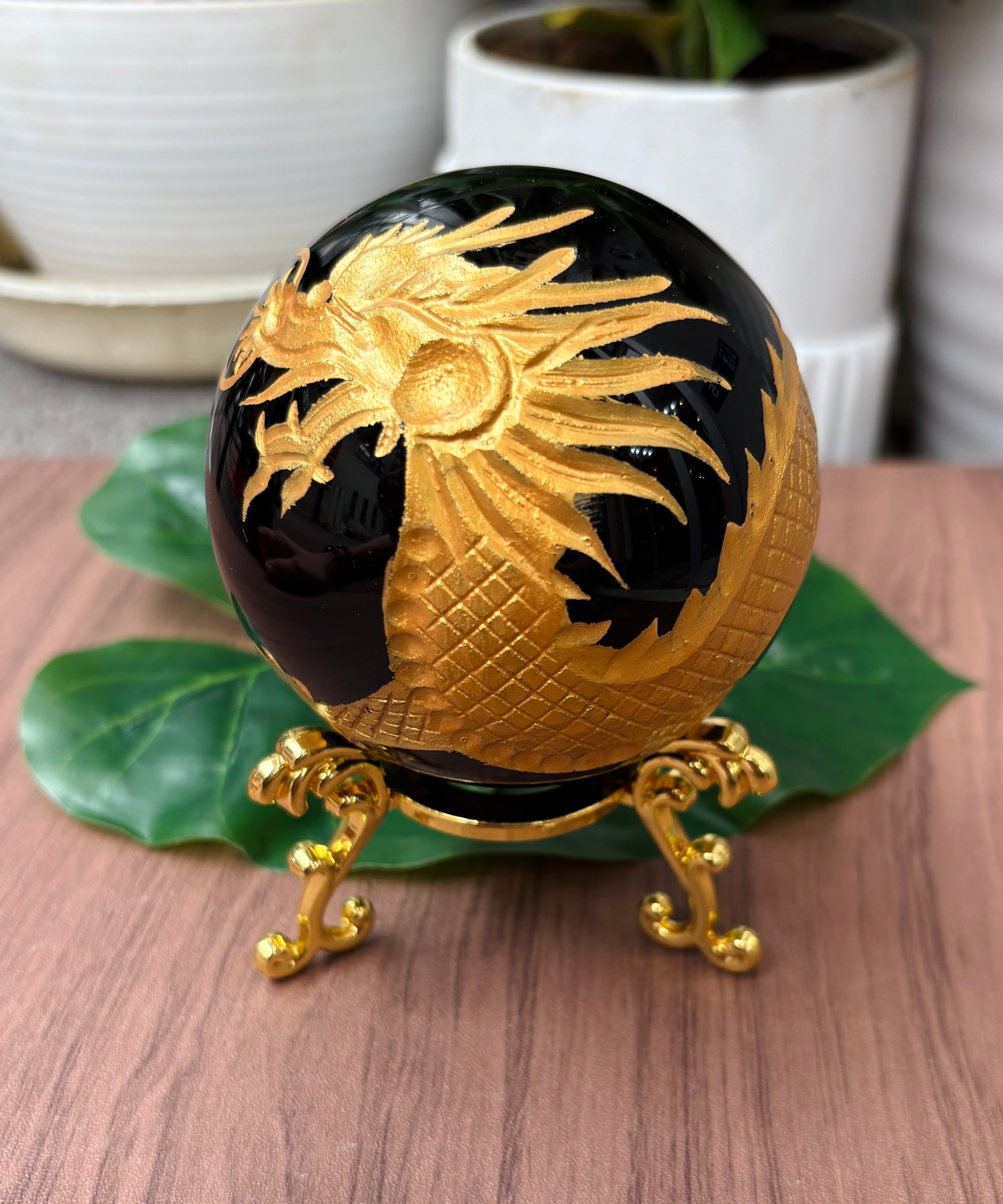 新着★お部屋の強力な魔除け!★ブラックオブシディアン★五本爪金龍彫丸玉☆台座付き