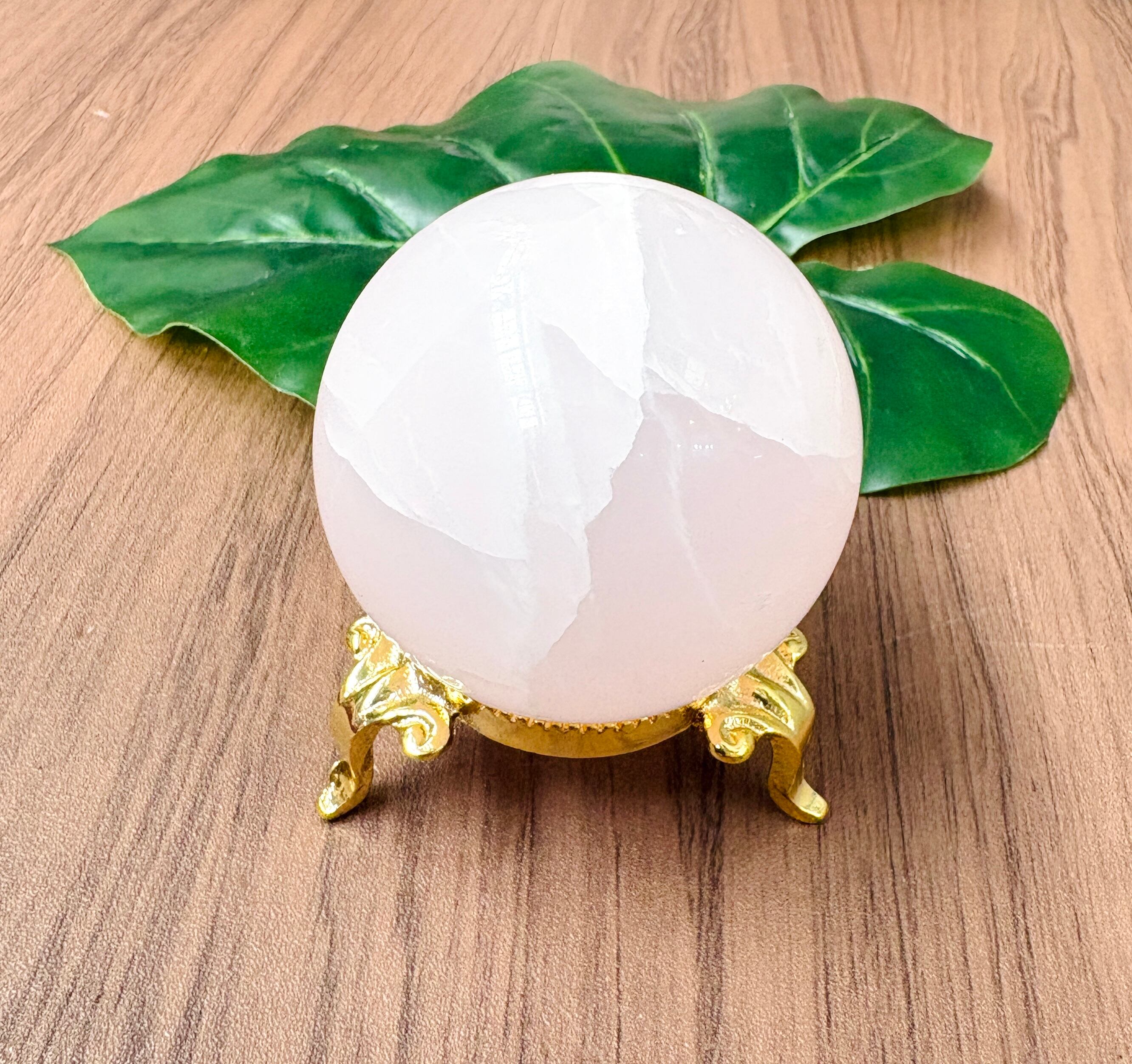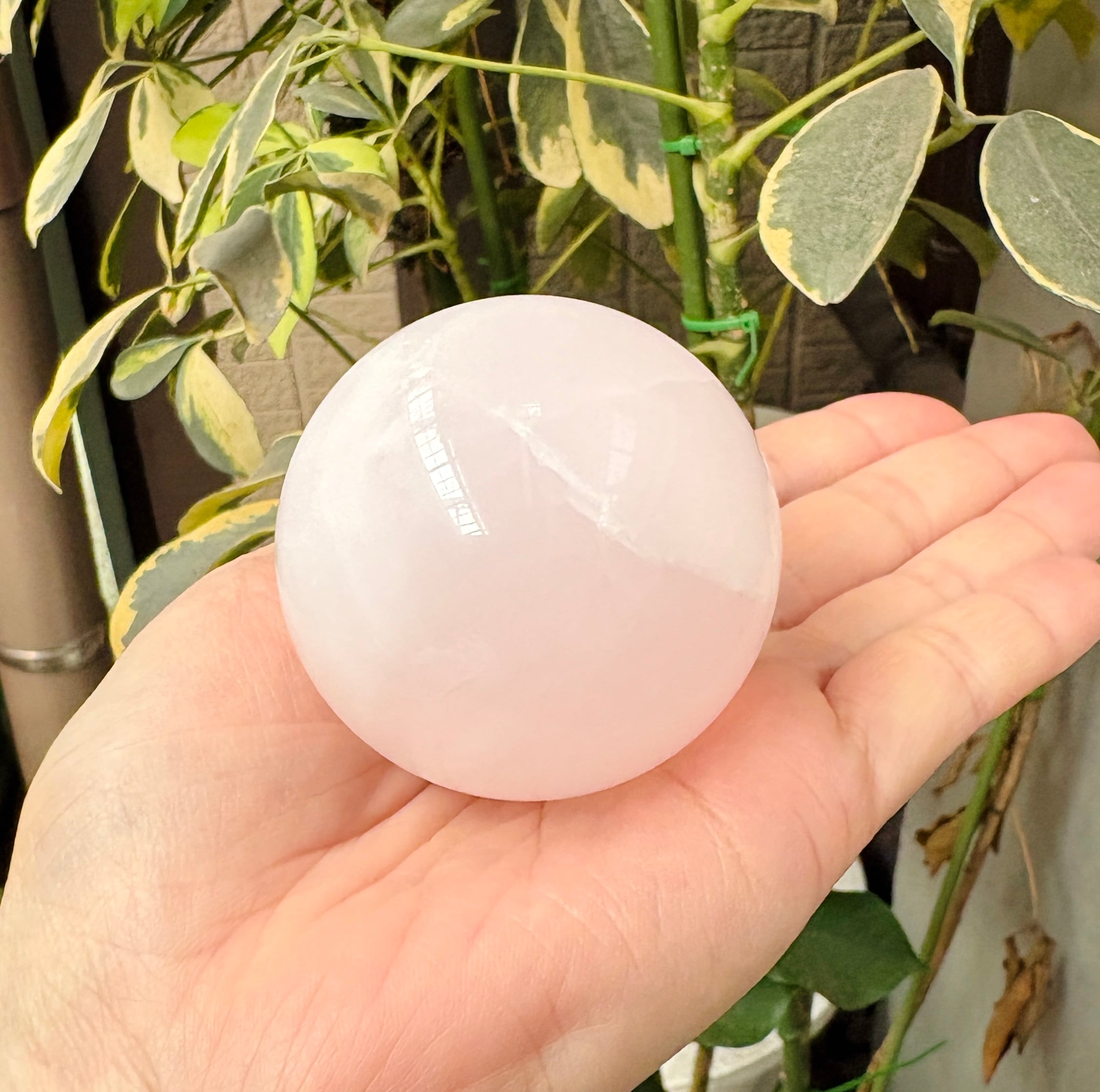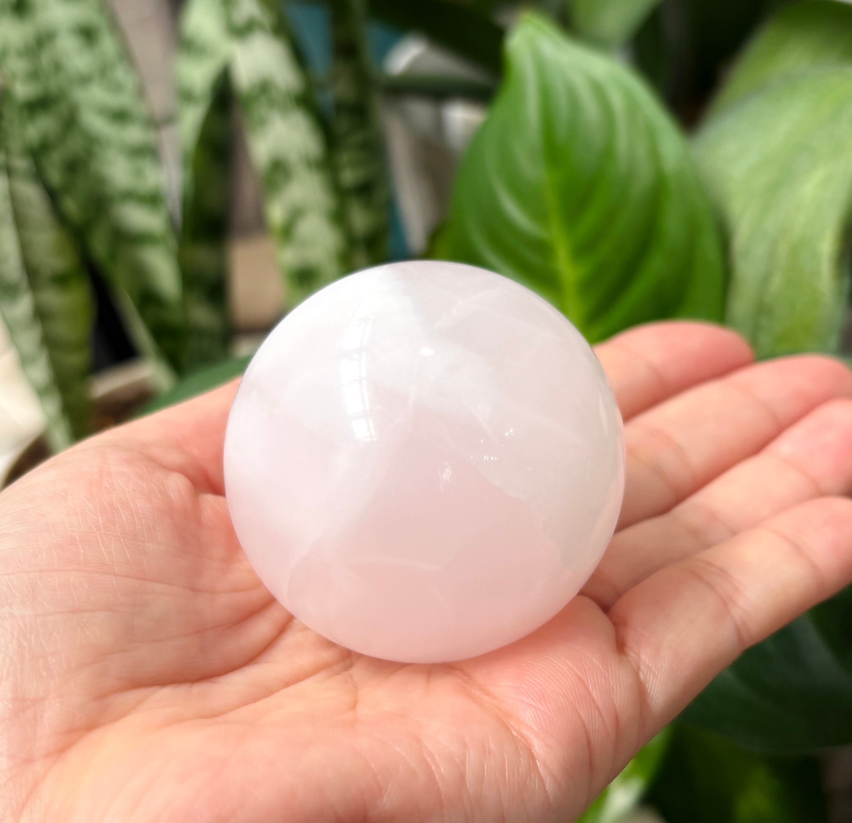 淡いミルキーピンクのかわいいピンクカルサイトの丸玉(台座付き)です。