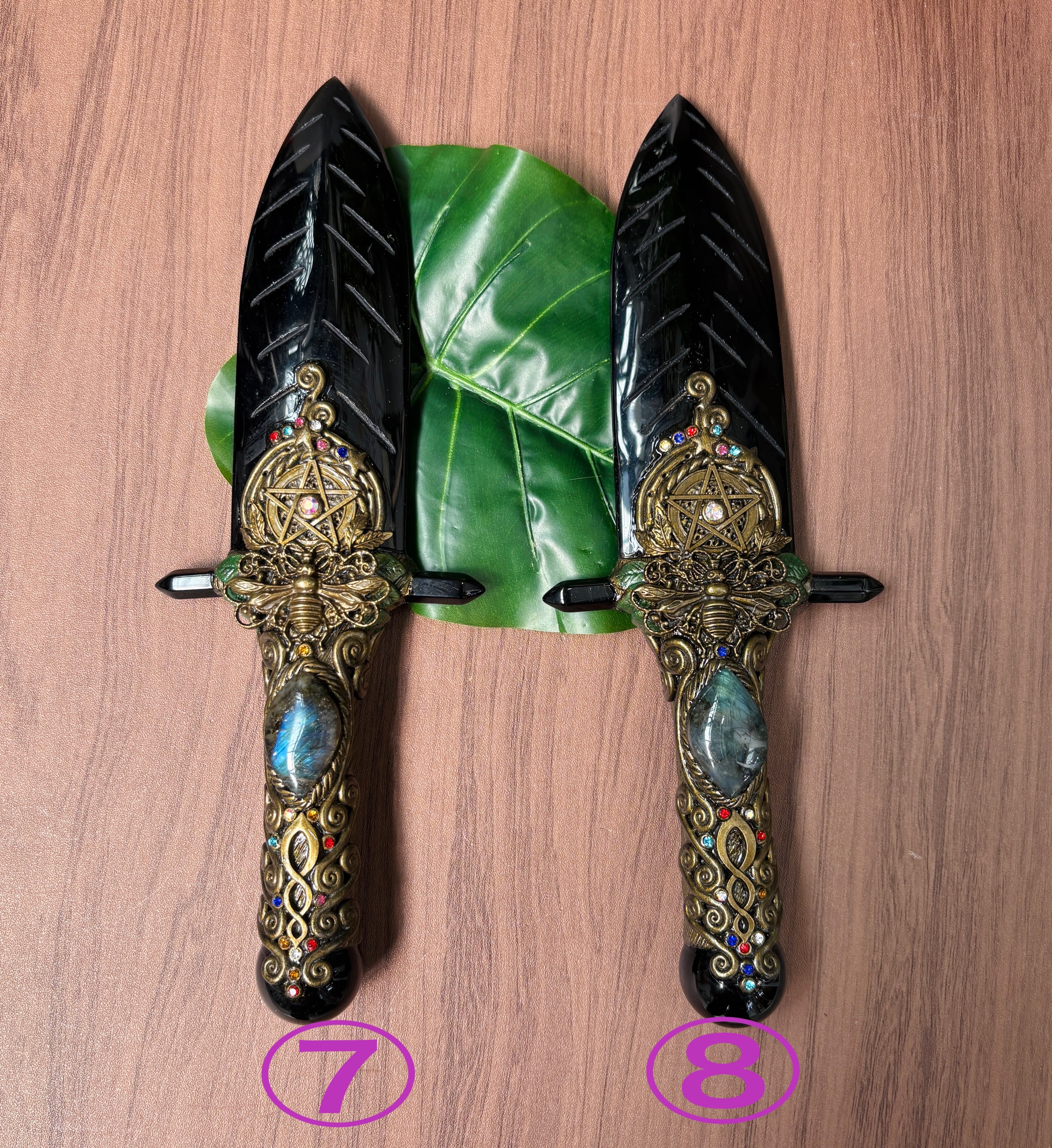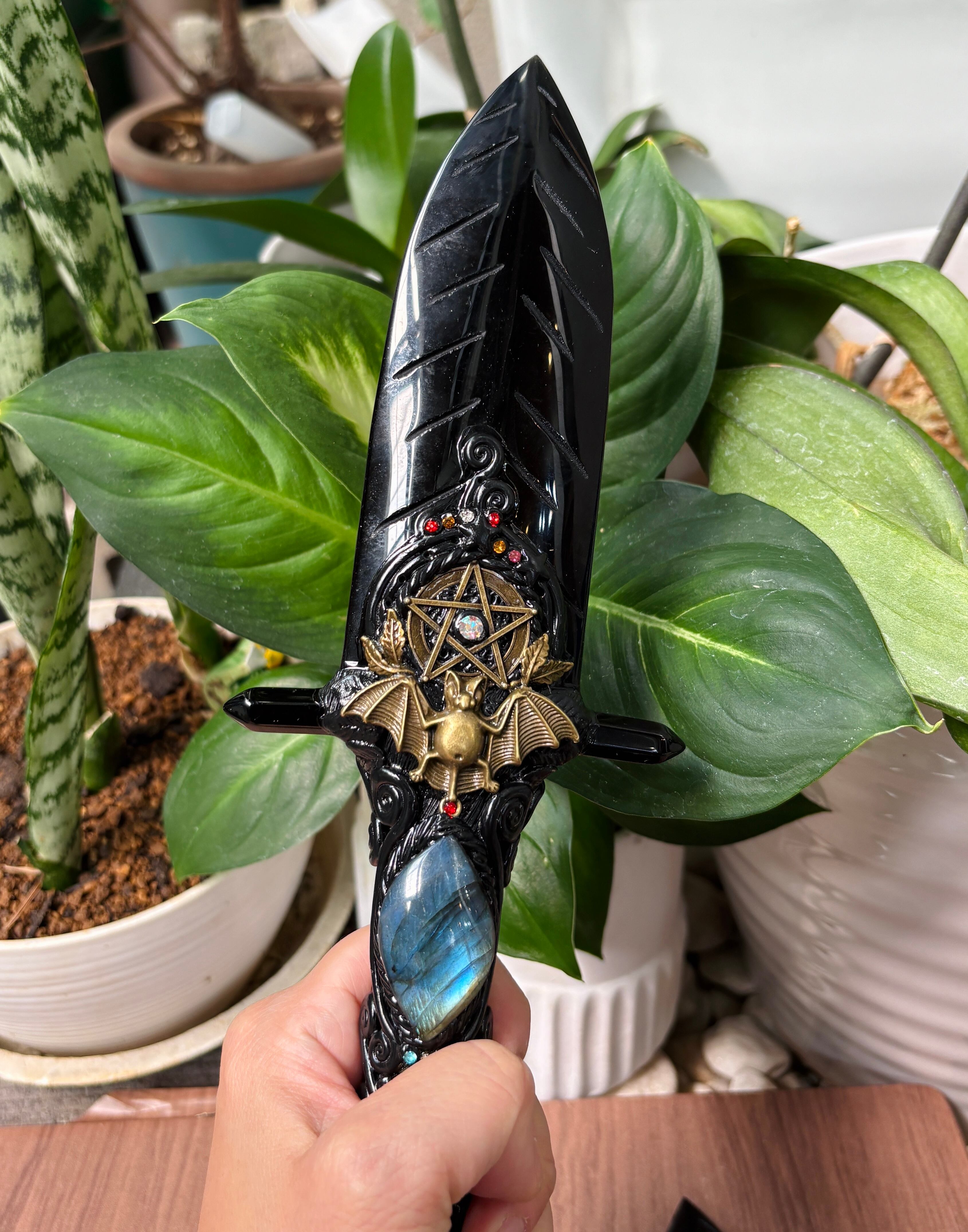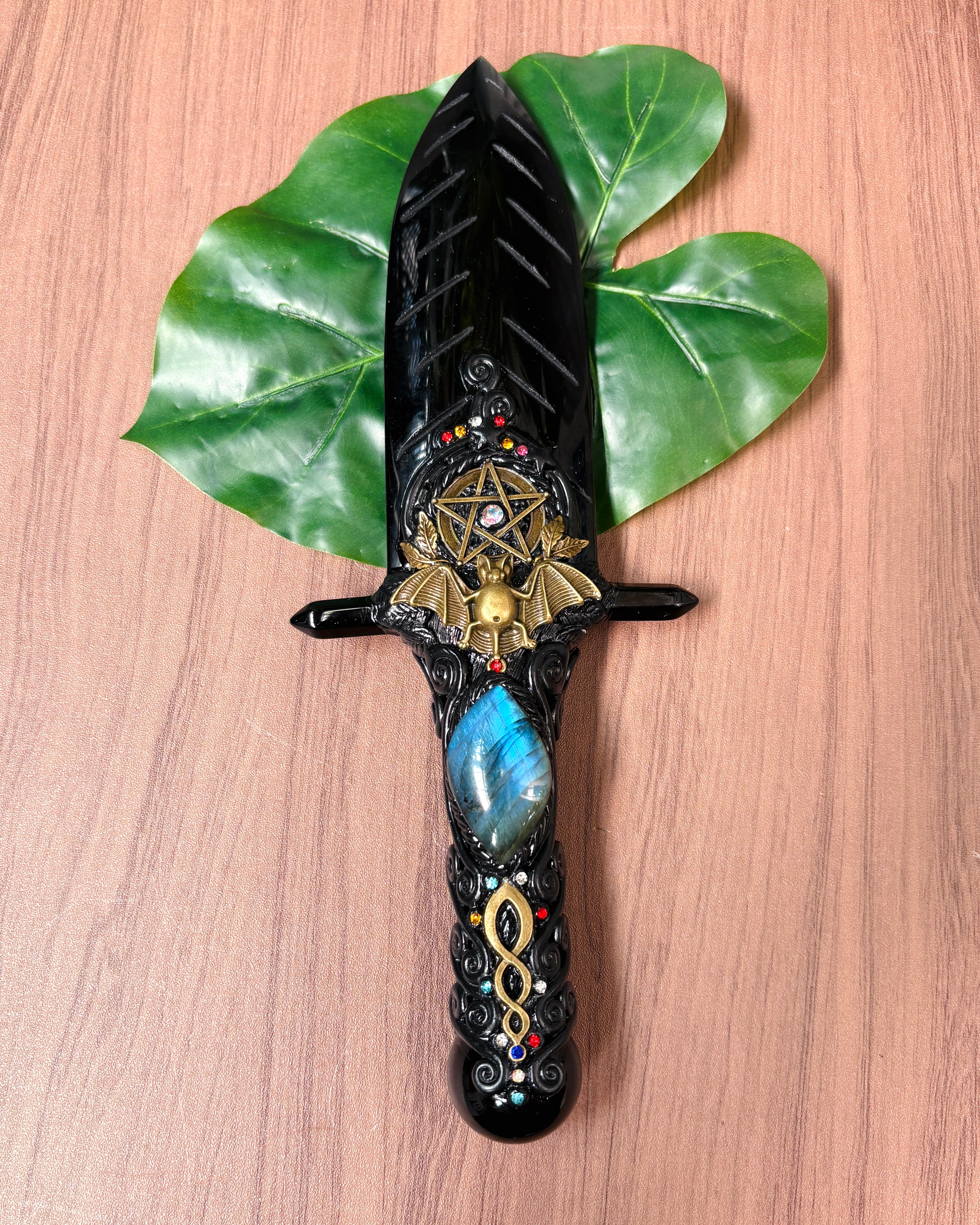 中央に魔除けの五芒星が配置され、下にラブラドライト、「魔除け」のコウモリや「繁栄」のシンボルであるハチが付いている高パワーナイフです!