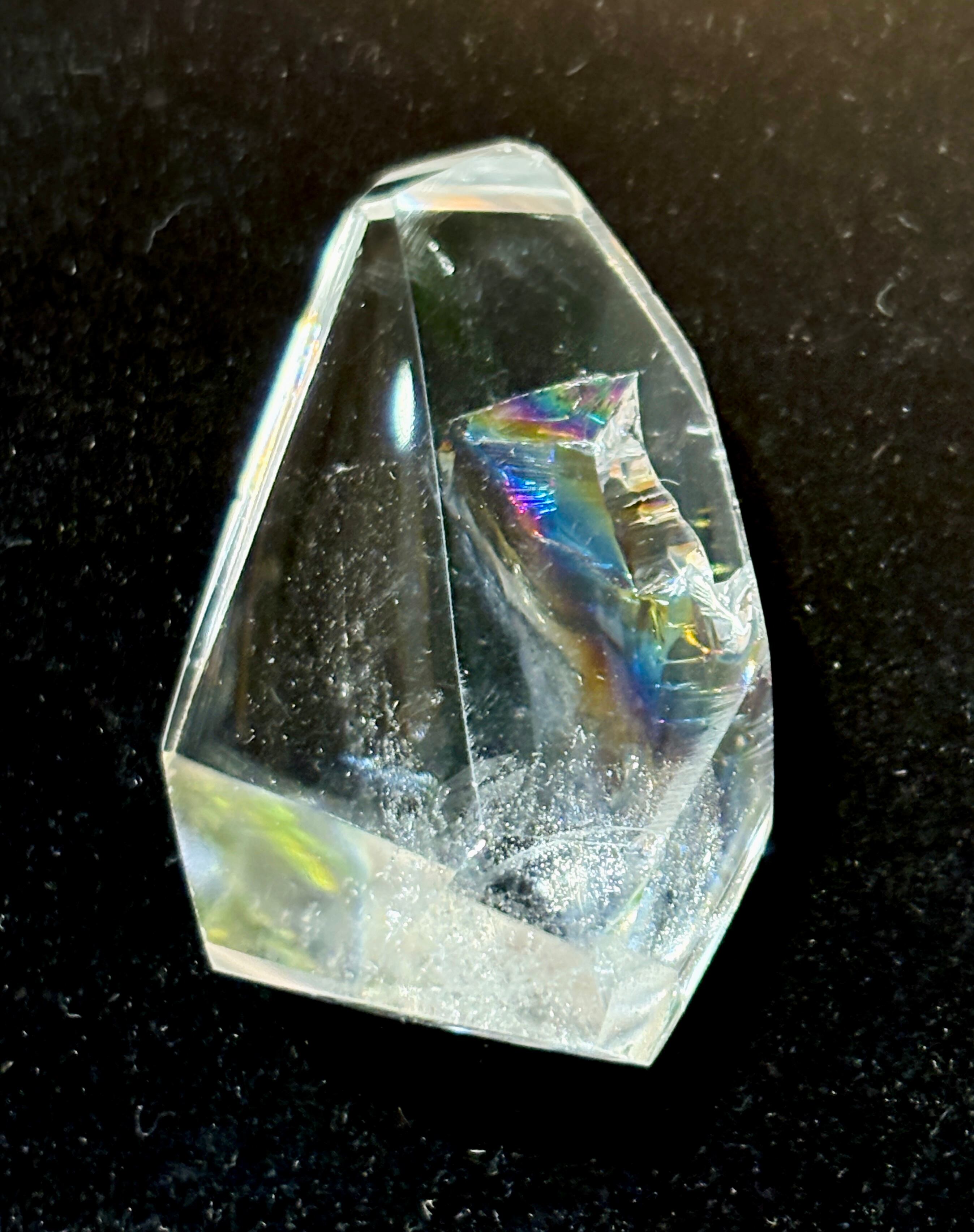 アイリスクォーツ(虹入り水晶・レインボー水晶)とは、水晶内部のクラック(割れた部分)やインクルージョン(内包物)に光があたりうつくしい虹色を出現させる水晶(レインボークォーツ)のことです。