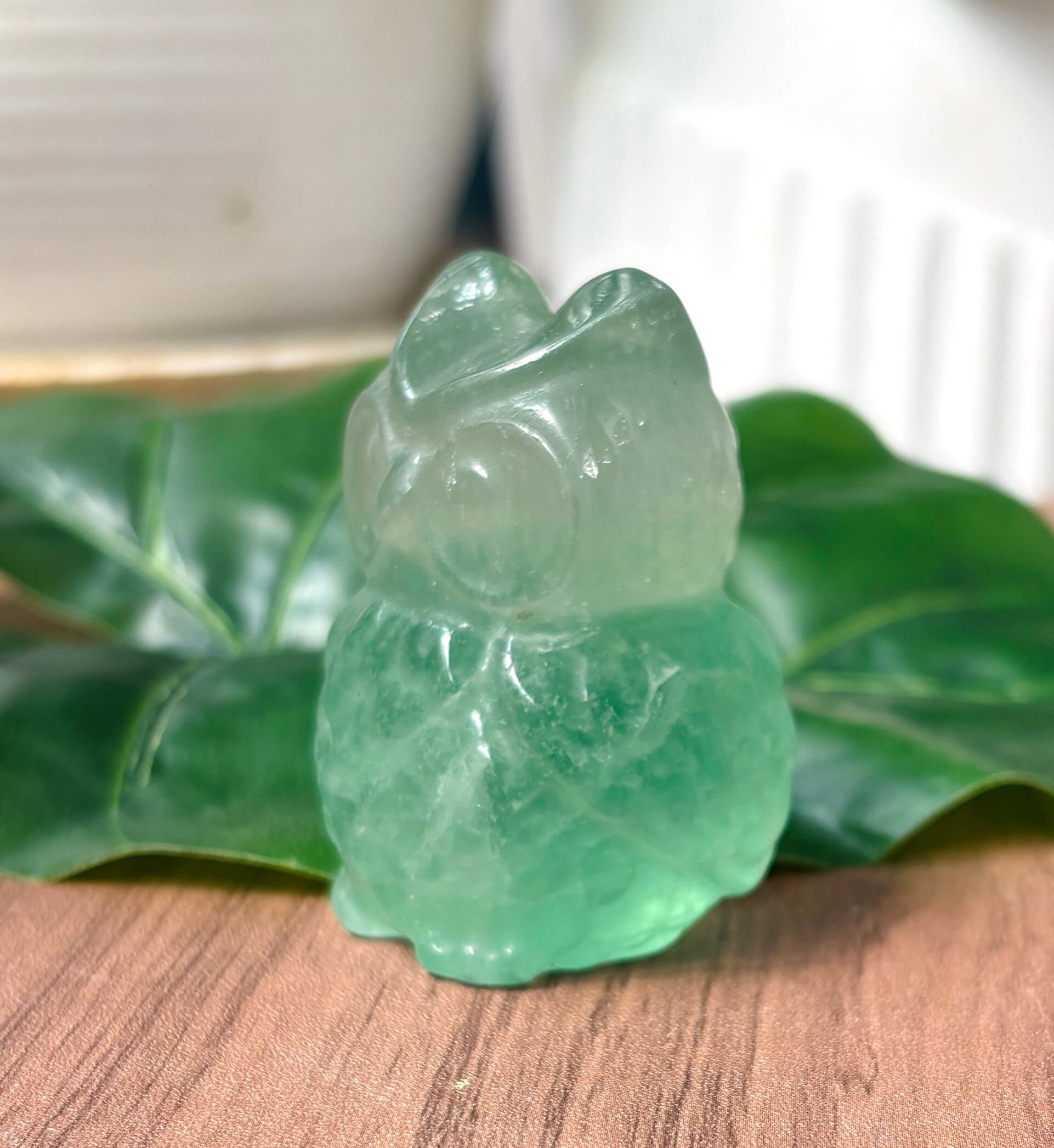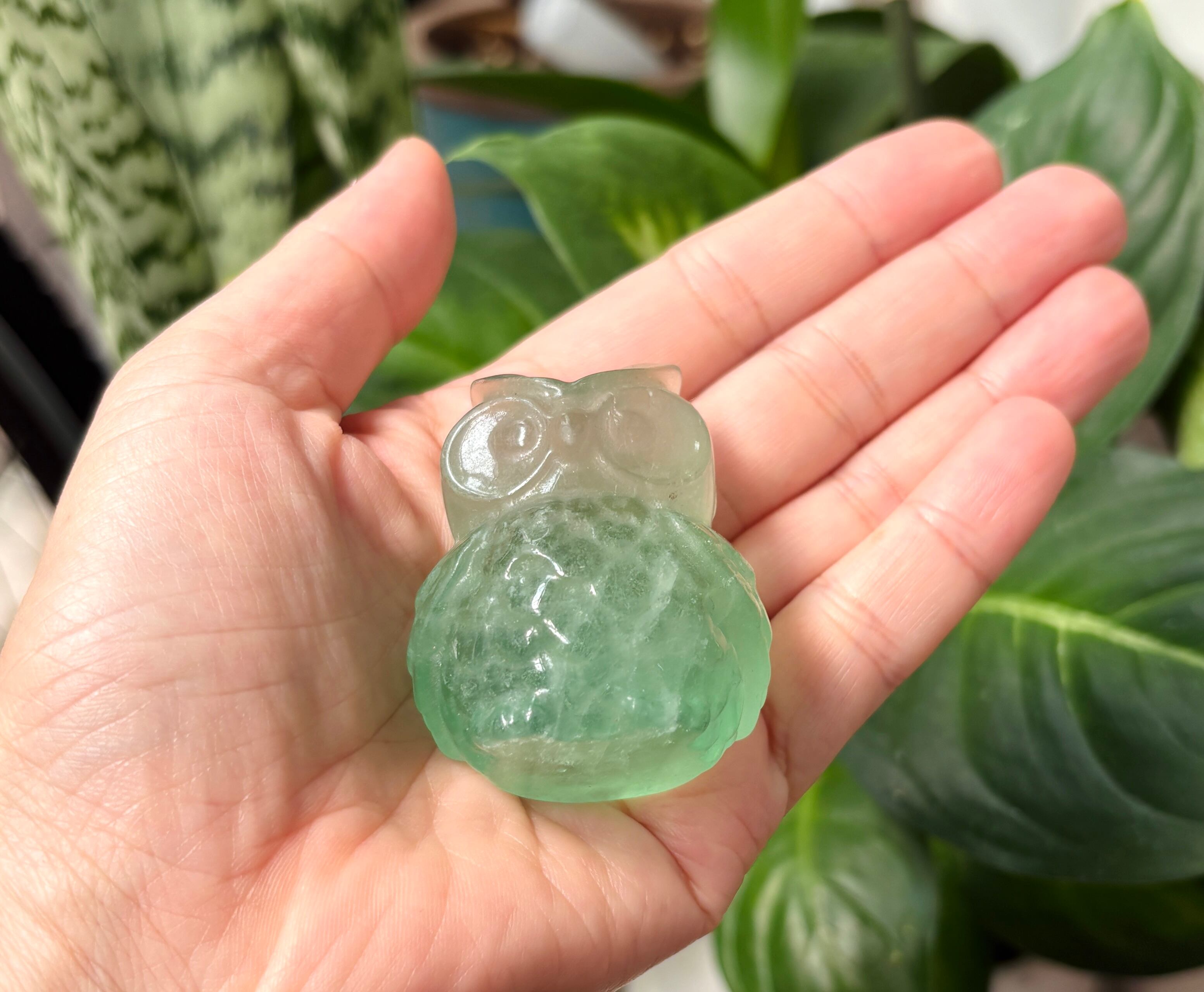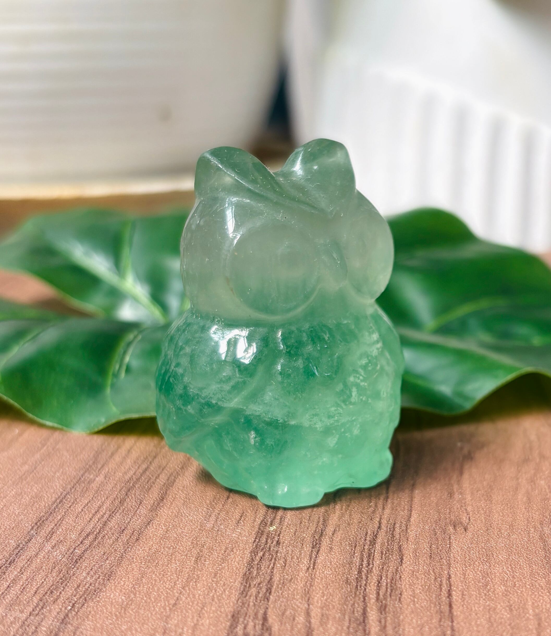 福を呼ぶ!フローライトでできた縁起物であるふくろうの置物です。