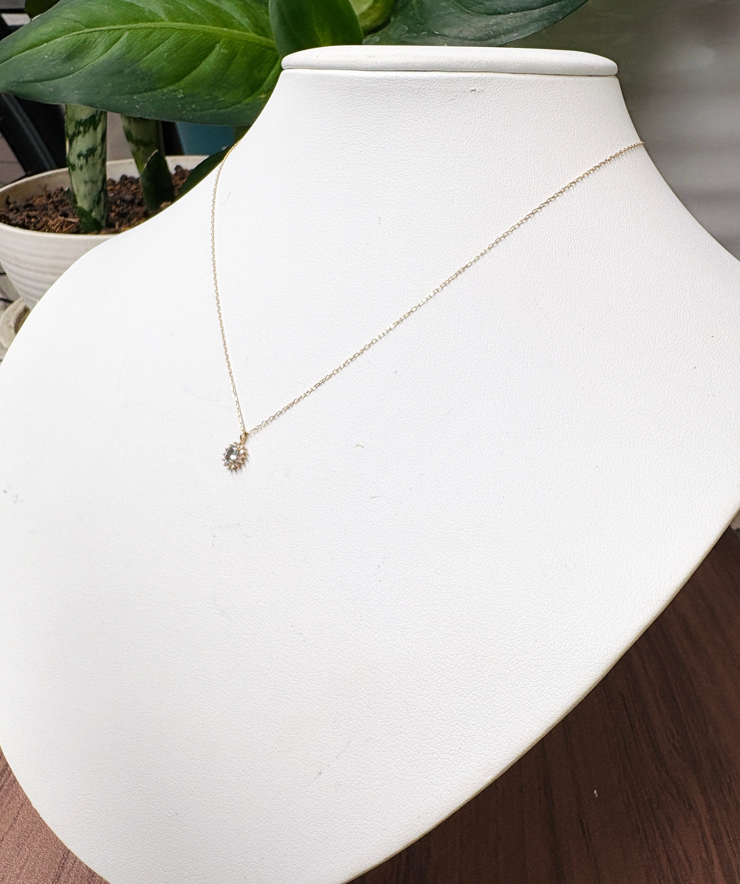 淡いブルーが美しいアクアマリンの周囲を最強パワーのダイヤモンドを贅沢に使用しているK10ペンダントです。(チェーン付き)