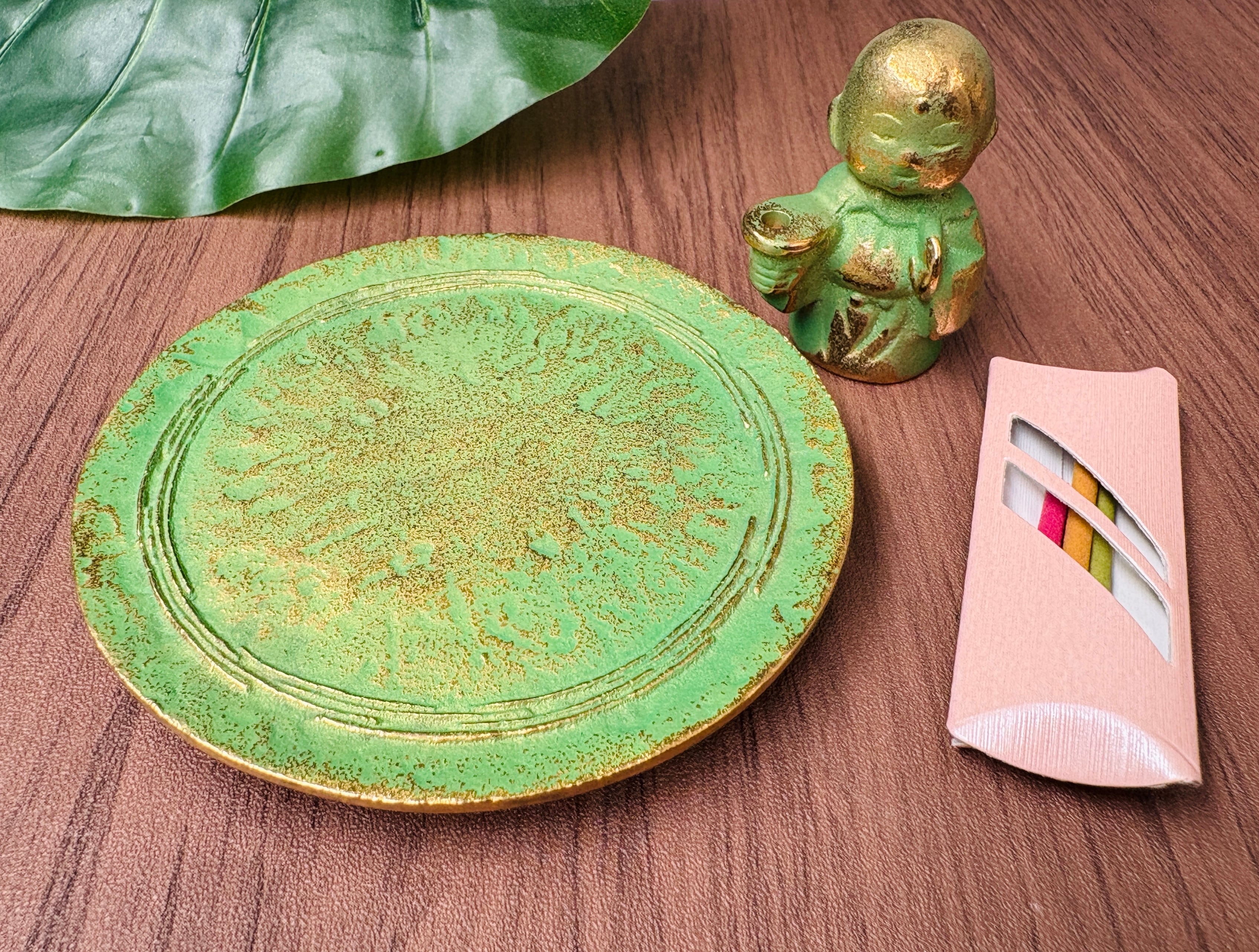 約400年の歴史を誇る富山・高岡銅器の伝統が息づく小さなお地蔵さまがそっとお香を手に持つ、なんとも微笑ましい香立てです。プチ香(3本)と専用香皿付きで、すぐに使えるセットです。