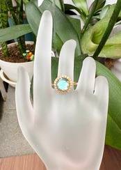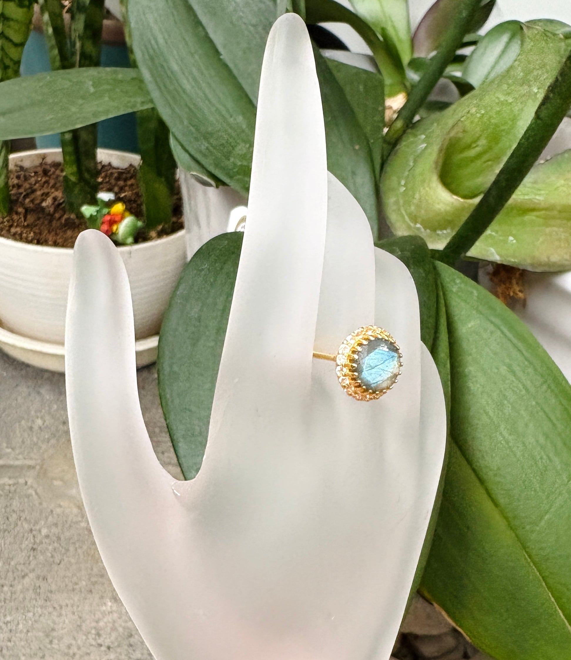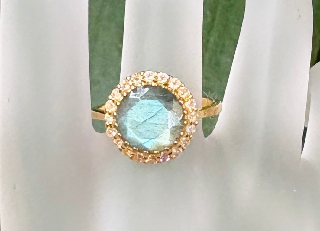 ひとつひとつ職人の手仕事によって作られており、真鍮に22ゴールドをメッキした素材に、ラブラドライトを使用したリングです。