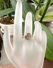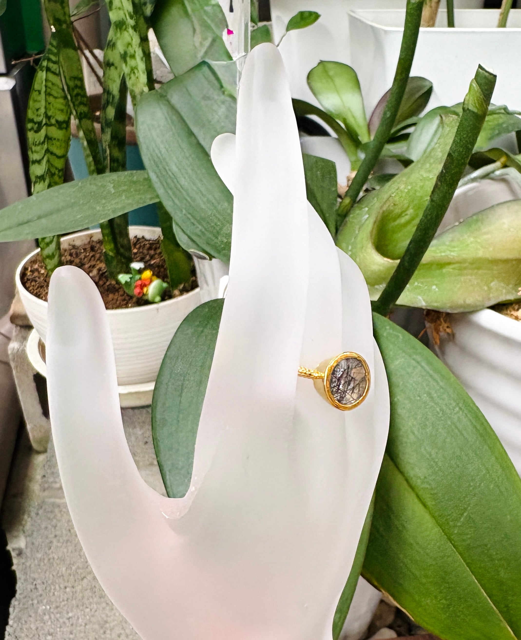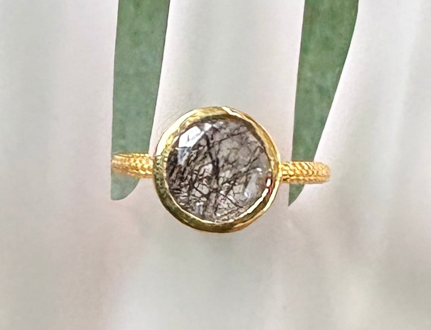 ひとつひとつ職人の手仕事によって作られており、真鍮に22ゴールドをメッキした素材にブラックルチルを使用したリング(約10号)です。