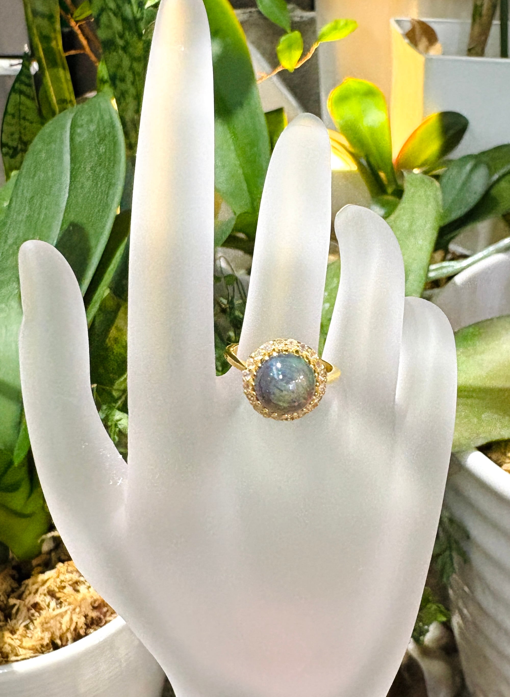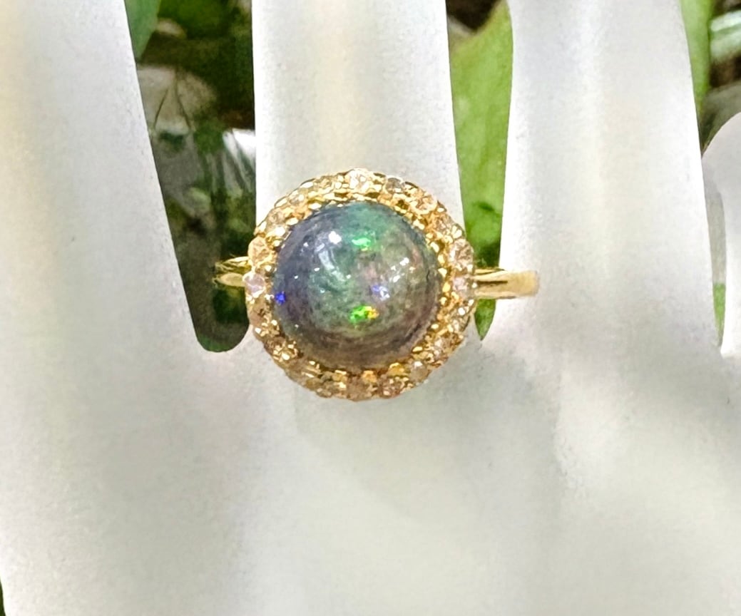 ひとつひとつ職人の手仕事によって作られており、真鍮に22ゴールドをメッキした素材に七色に輝くブラックオパールを使用した存在感抜群のリング(約10号)です。