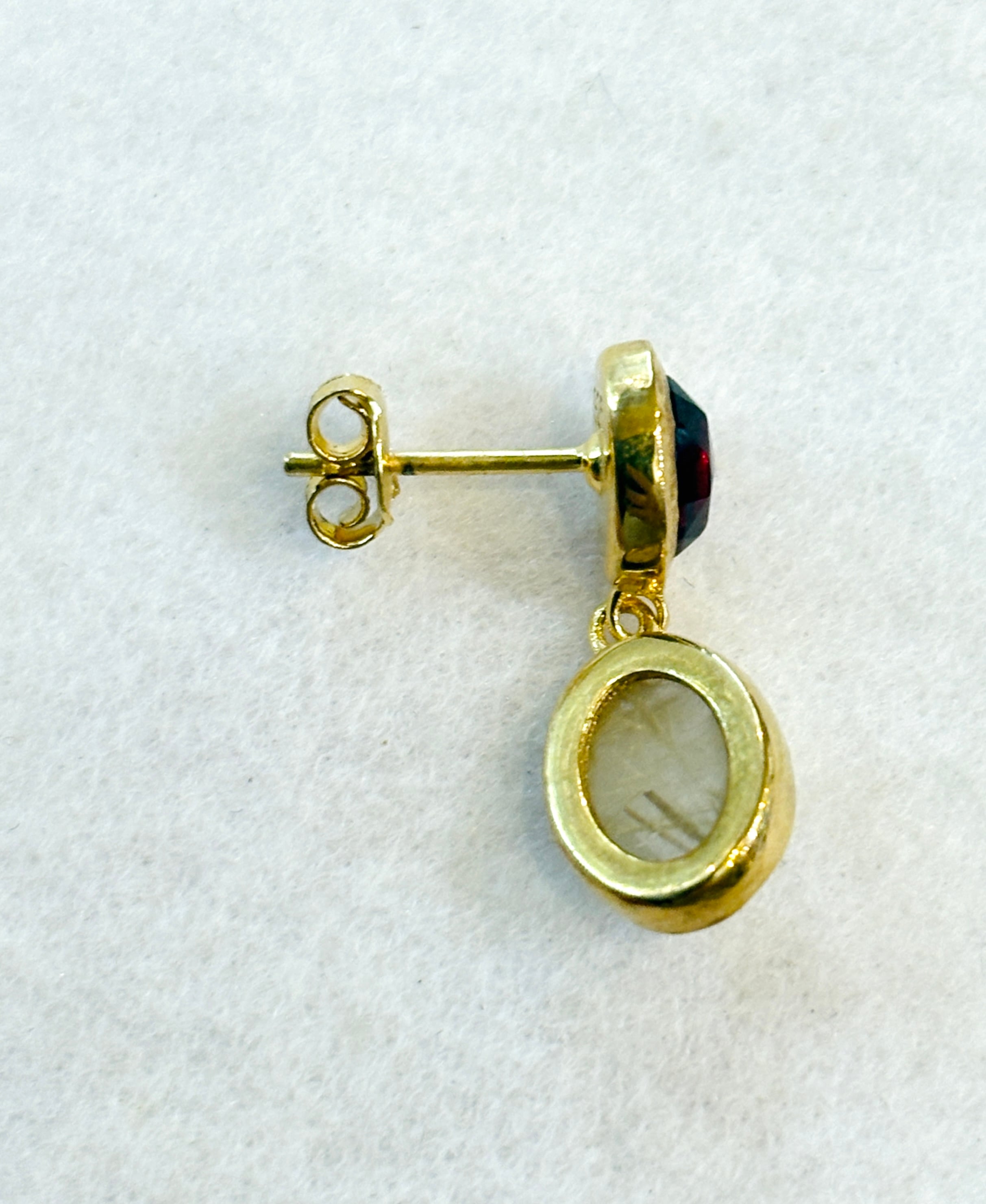 ひとつひとつ職人の手仕事によって作られており、真鍮に22ゴールドをメッキした素材に、ガーネットとルチルクォーツを贅沢に使用したピアスです。