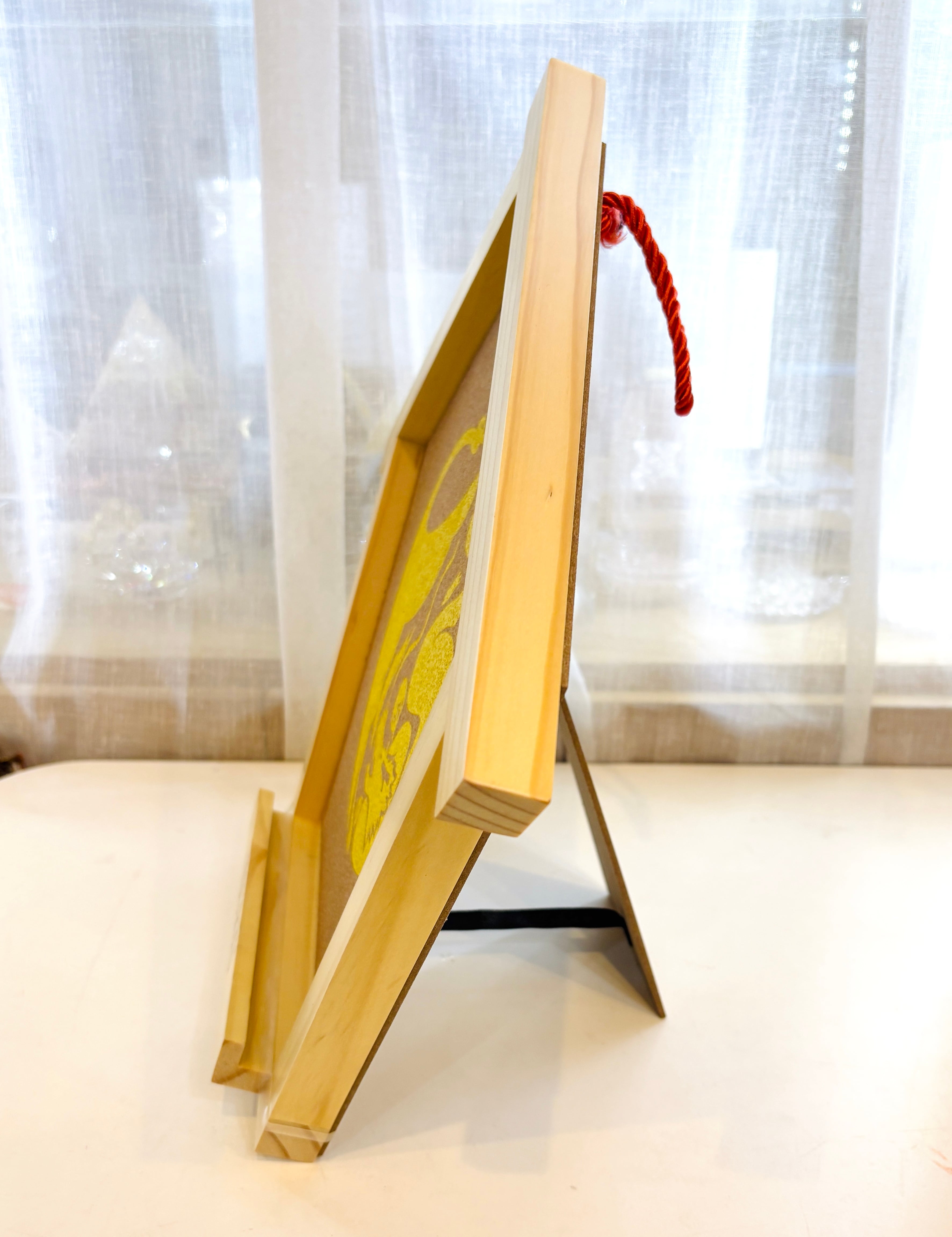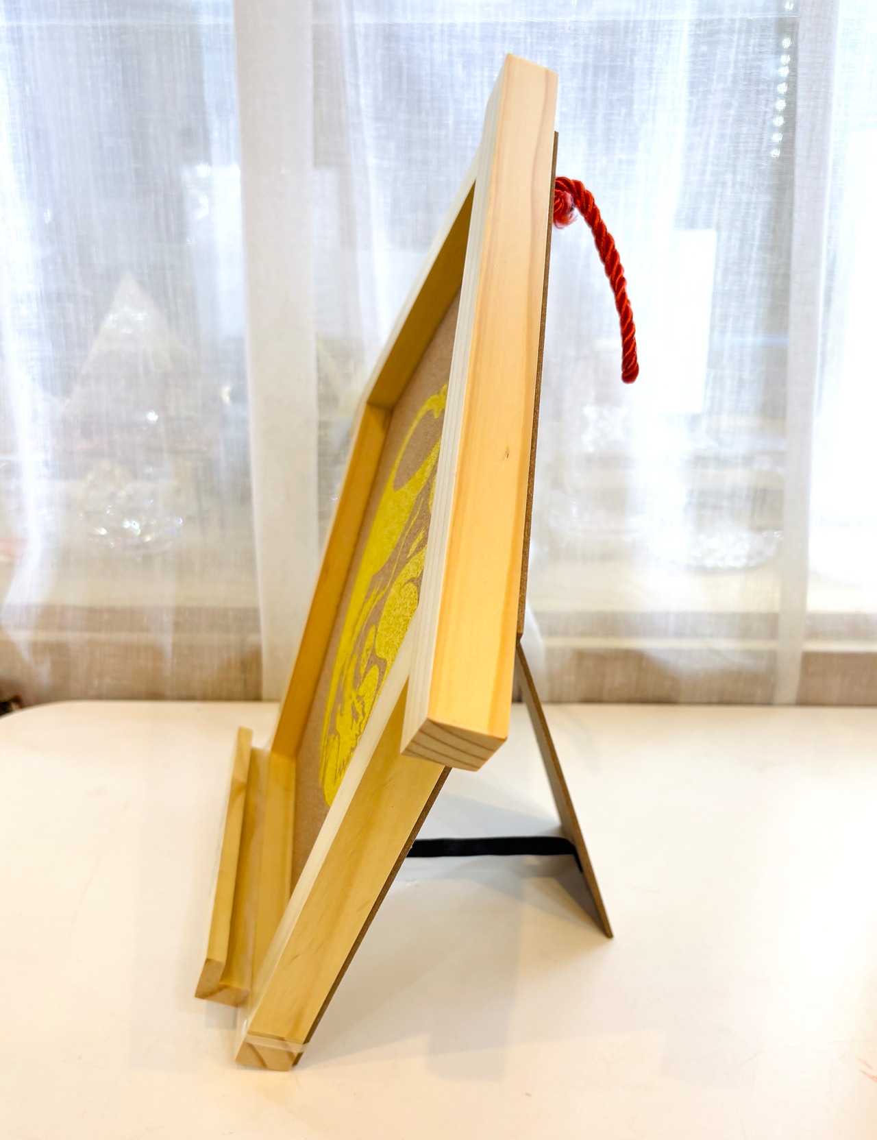 テーブルにそのまま置くことも可能ですが、紐がついており、壁掛けにもできます。(付属の透明のゴムを上部に上げてお札を固定してください)