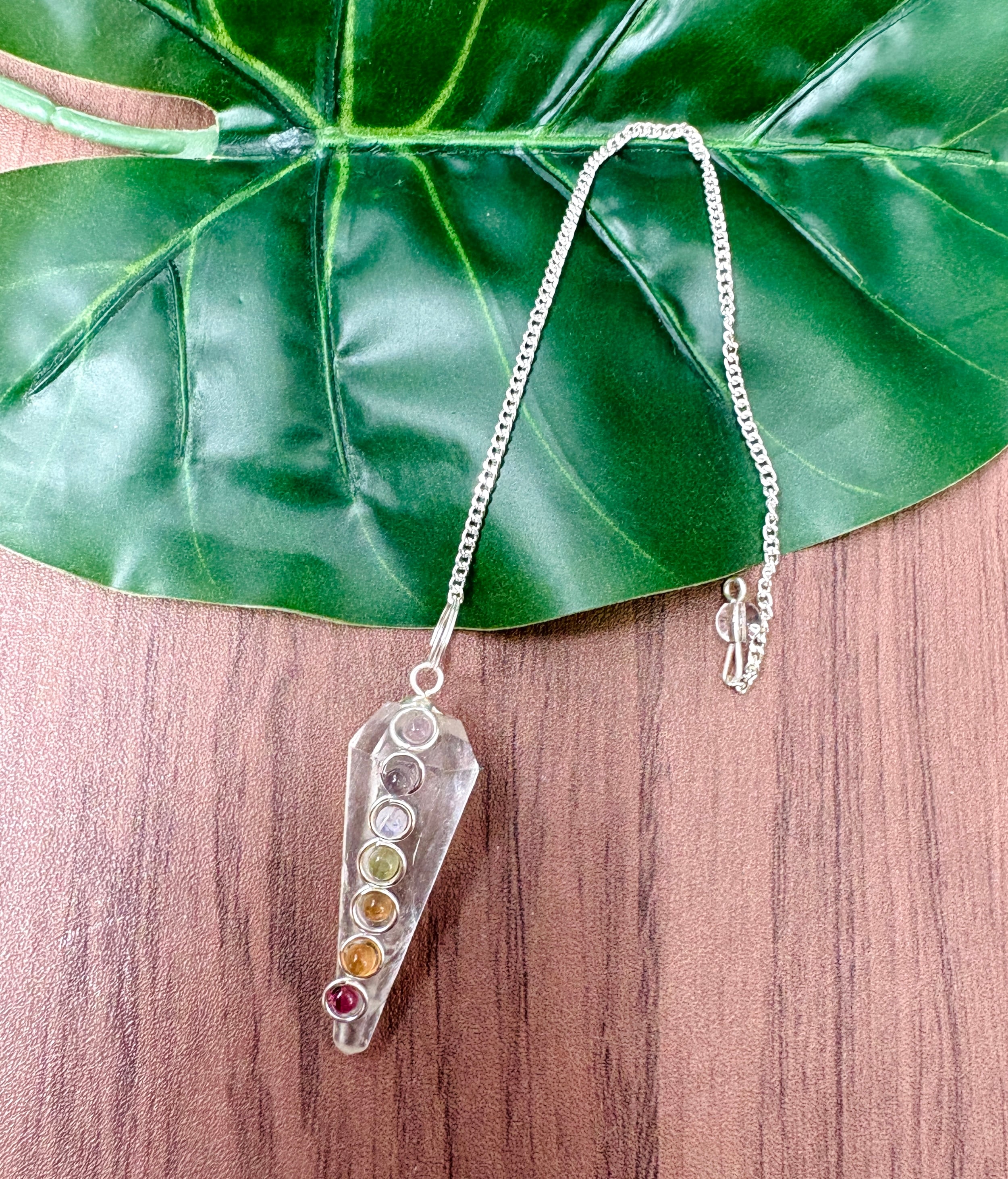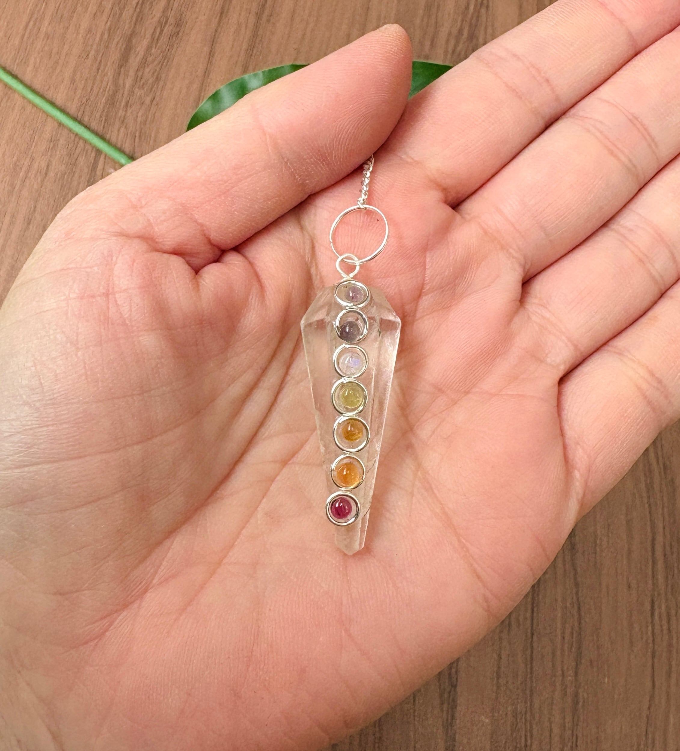 ヒマラヤ水晶のペンデュラムにチャクラカラーの石が装飾が施されたペンデュラムです!