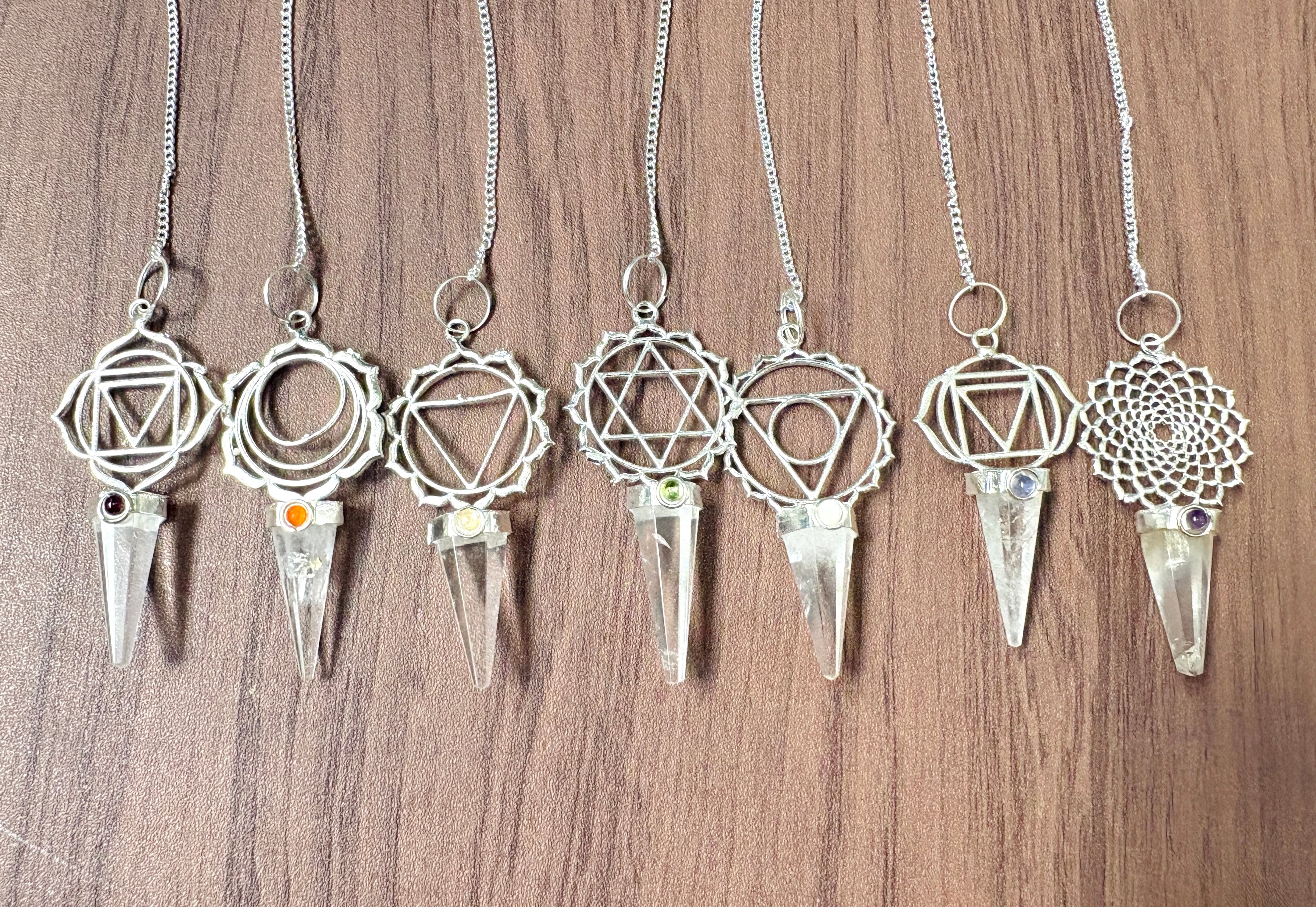 ヒマラヤ水晶のペンデュラムに1から7チャクラのシンボルが装飾が施されたペンデュラム7個セットです!
