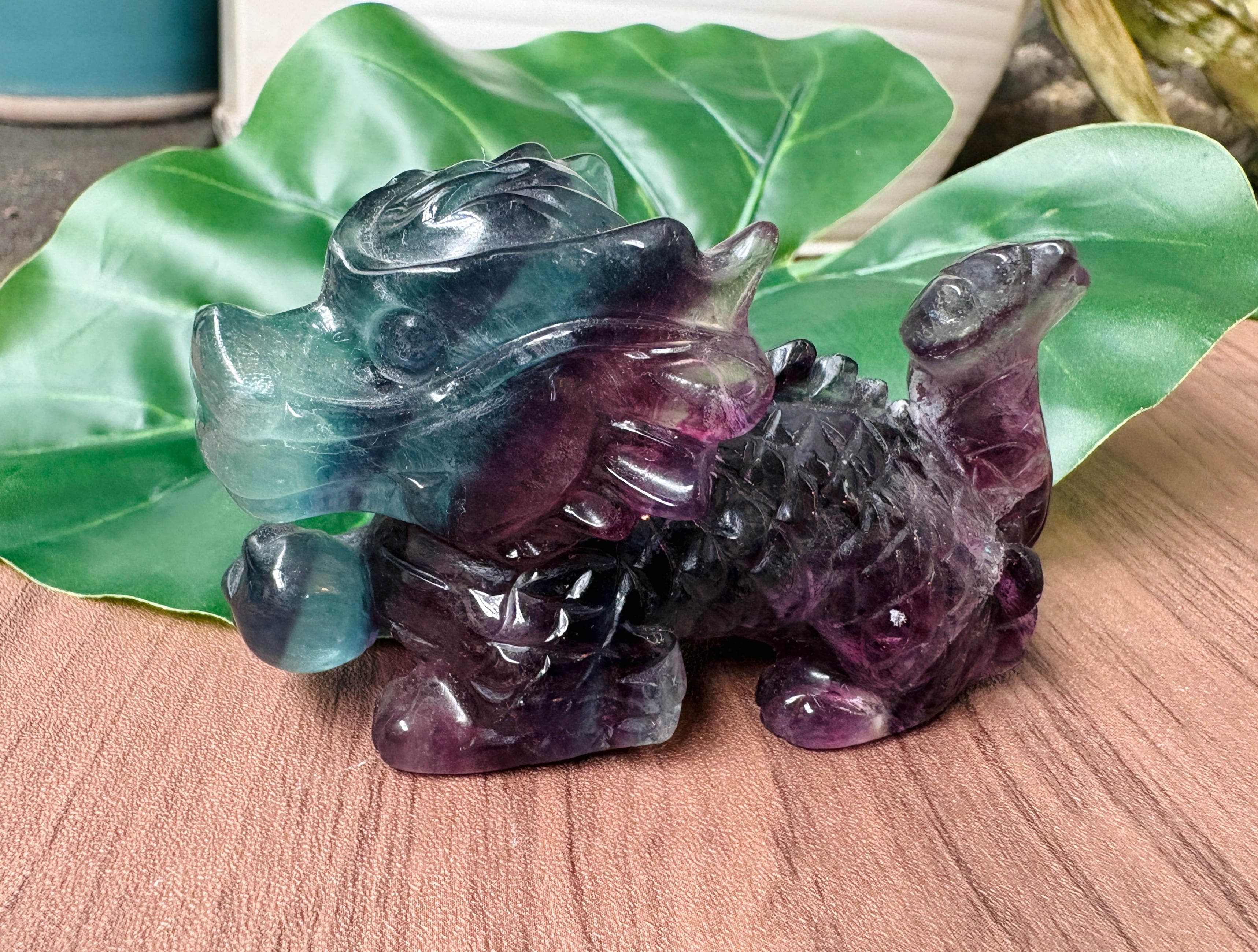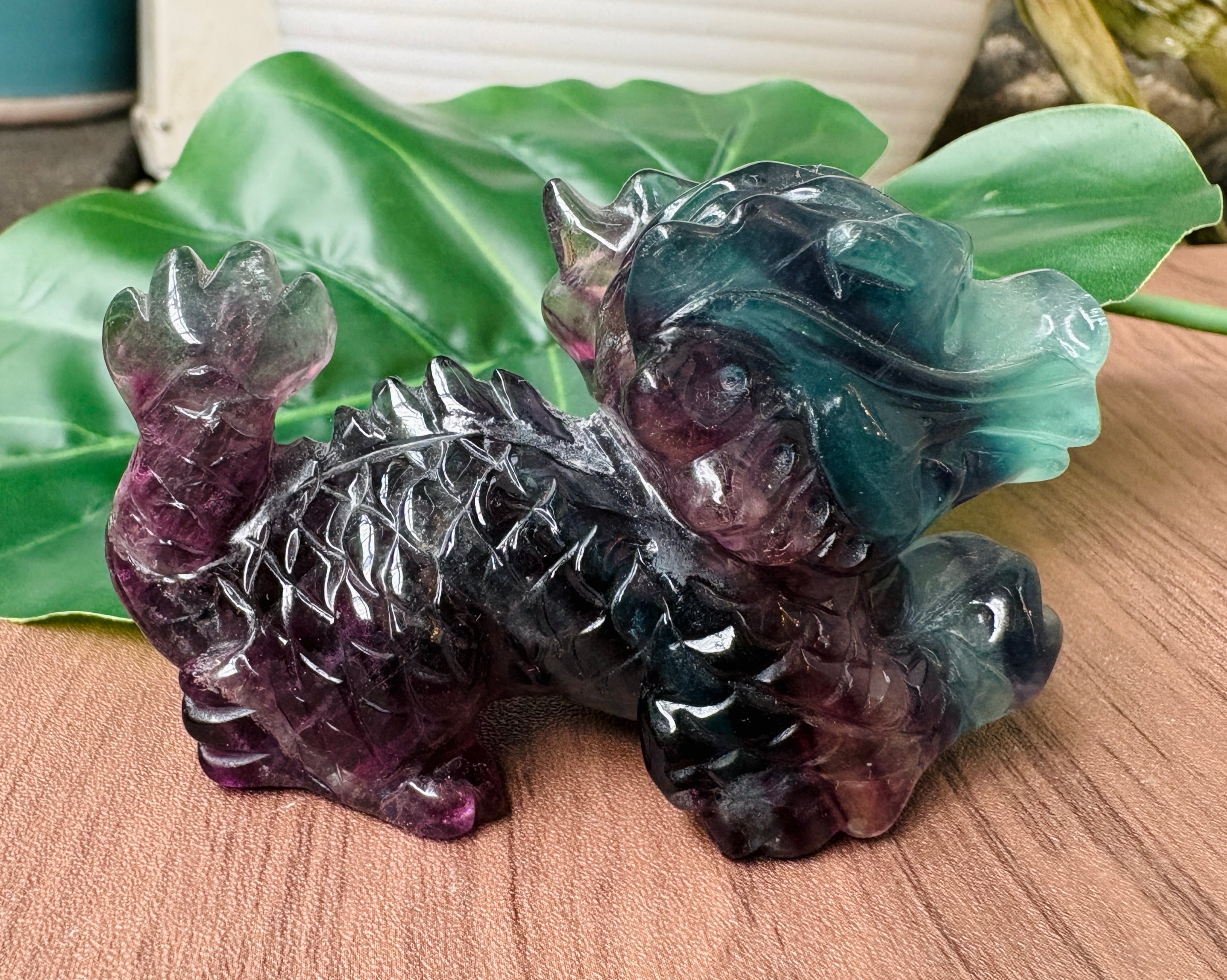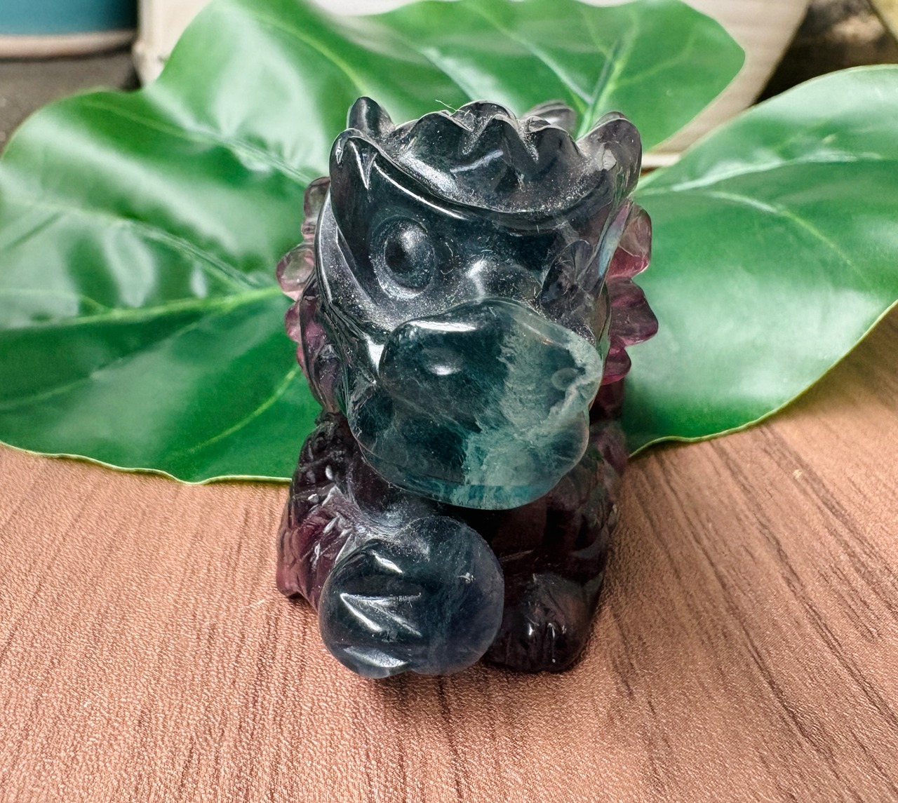 フローライトらしいパープルとグラデーションが美しい珠持ち龍龍の置物です。
