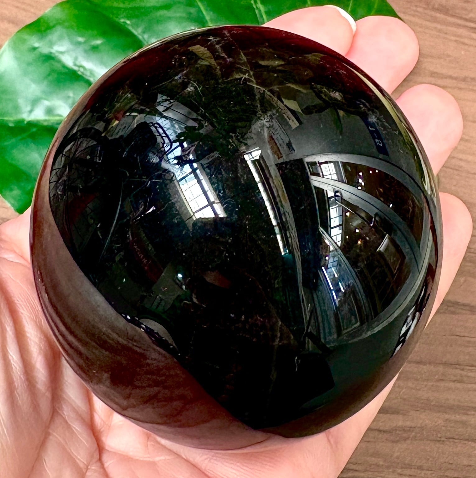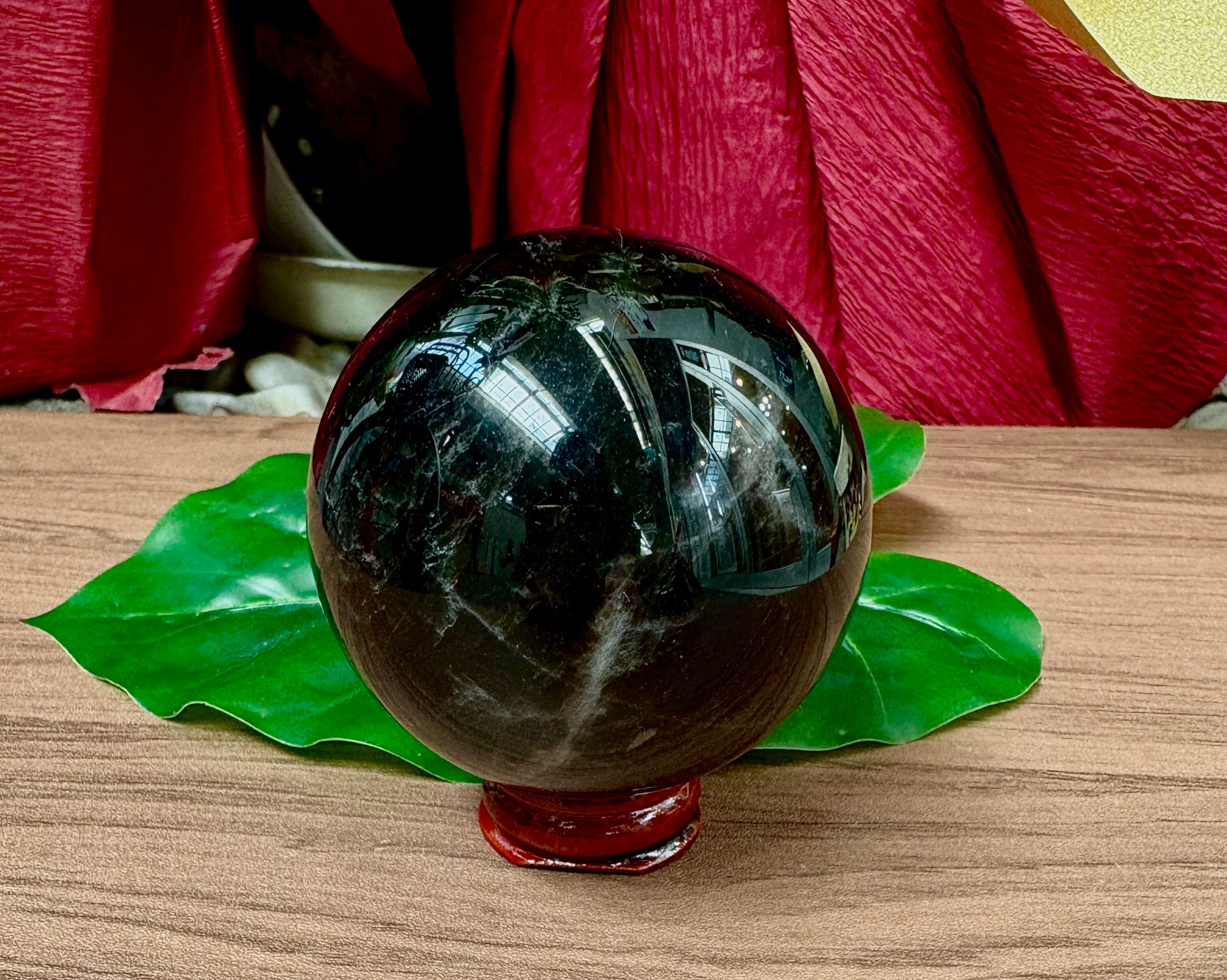 吸い込まれそうな漆黒色の良質なモリオン(黒水晶)の丸玉です。