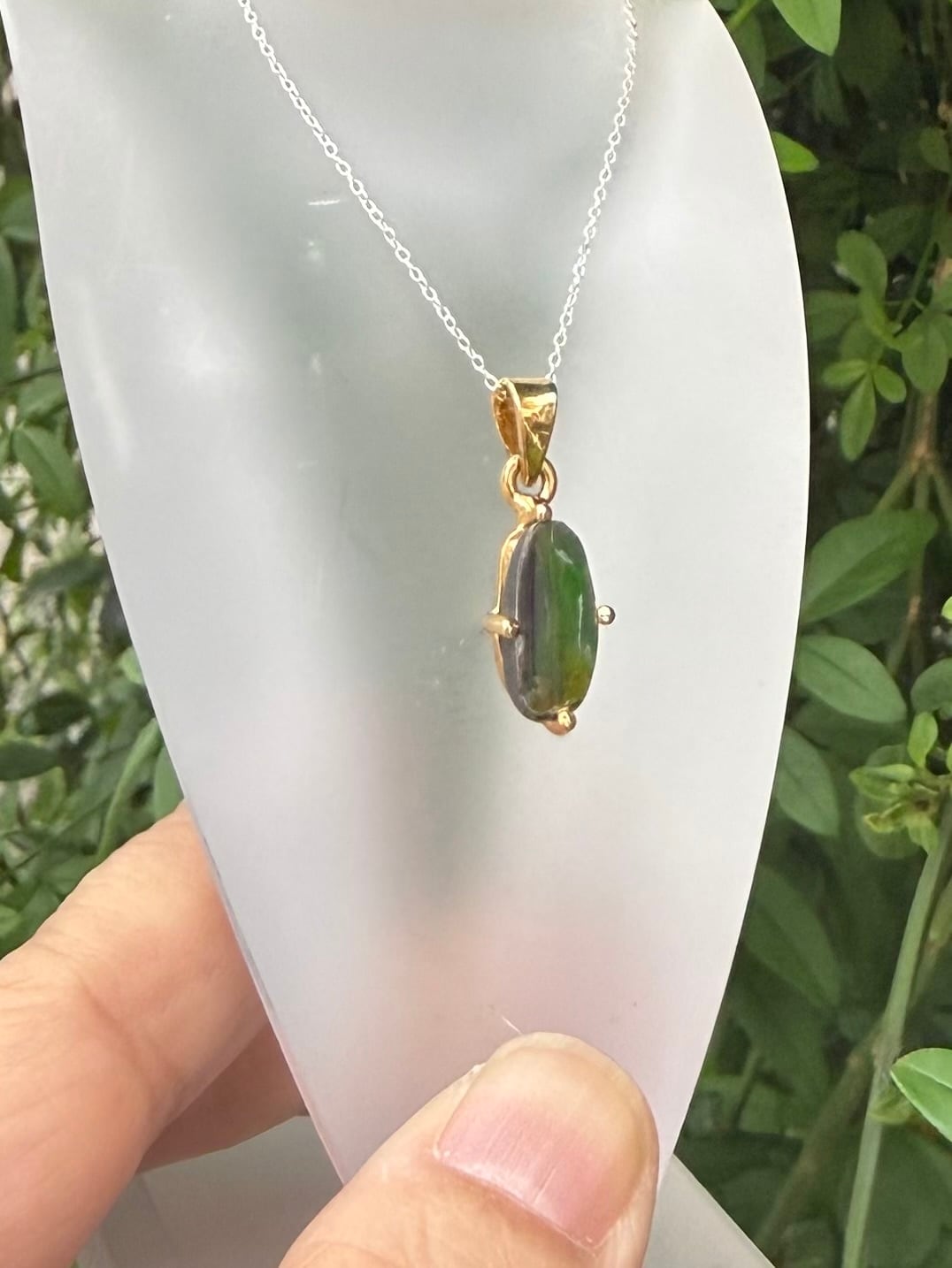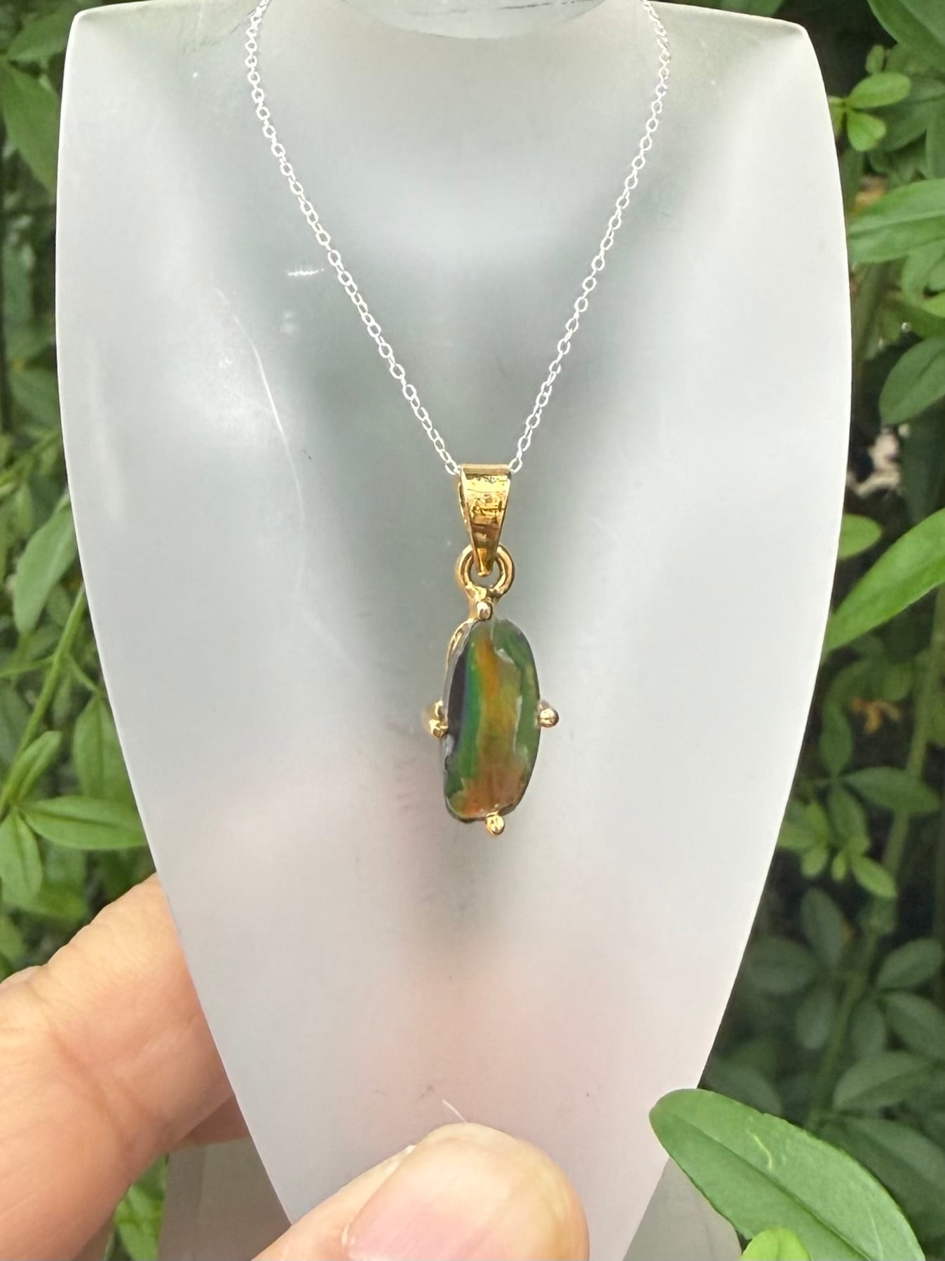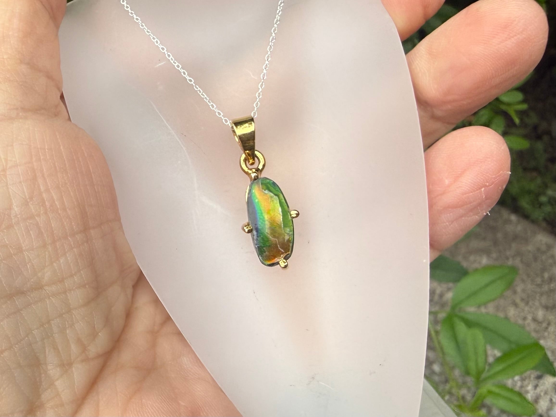 グリーンを主に赤やオレンジと複数のカラーに反射する美しい高パワー!アンモライトペンダントトップです(チェーン別売)