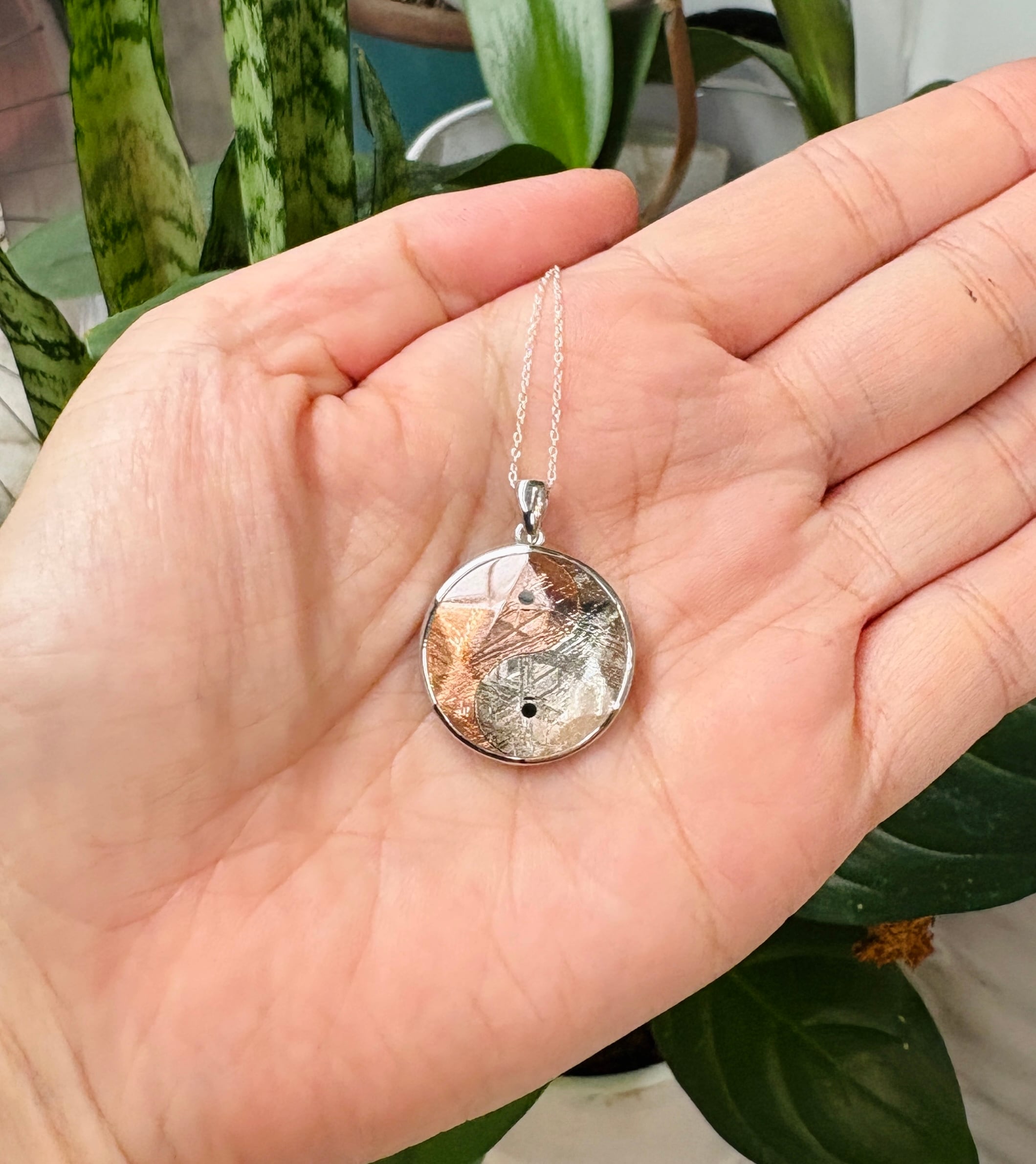 シルバーとピンクゴールドのギベオン隕石に陰陽マークが両面にあり、上に六芒星が配置されている超高パワー!ペンダントトップです。(チェーン別売り)