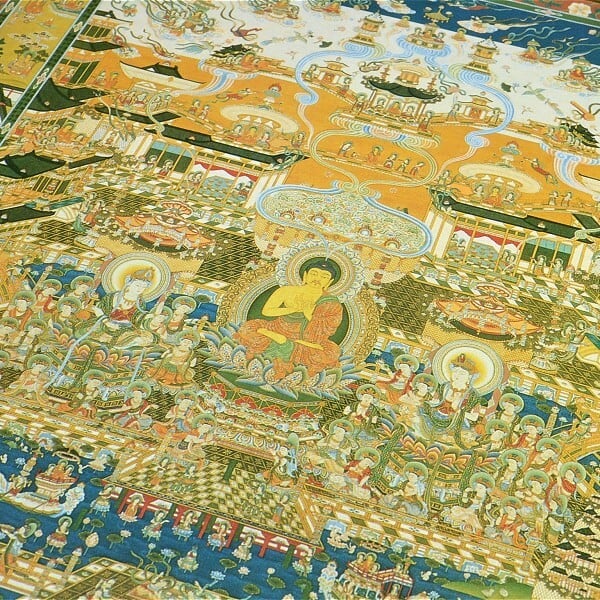 「観無量寿経」に基づき描かれ、阿弥陀如来を中央とする極楽浄土図です。