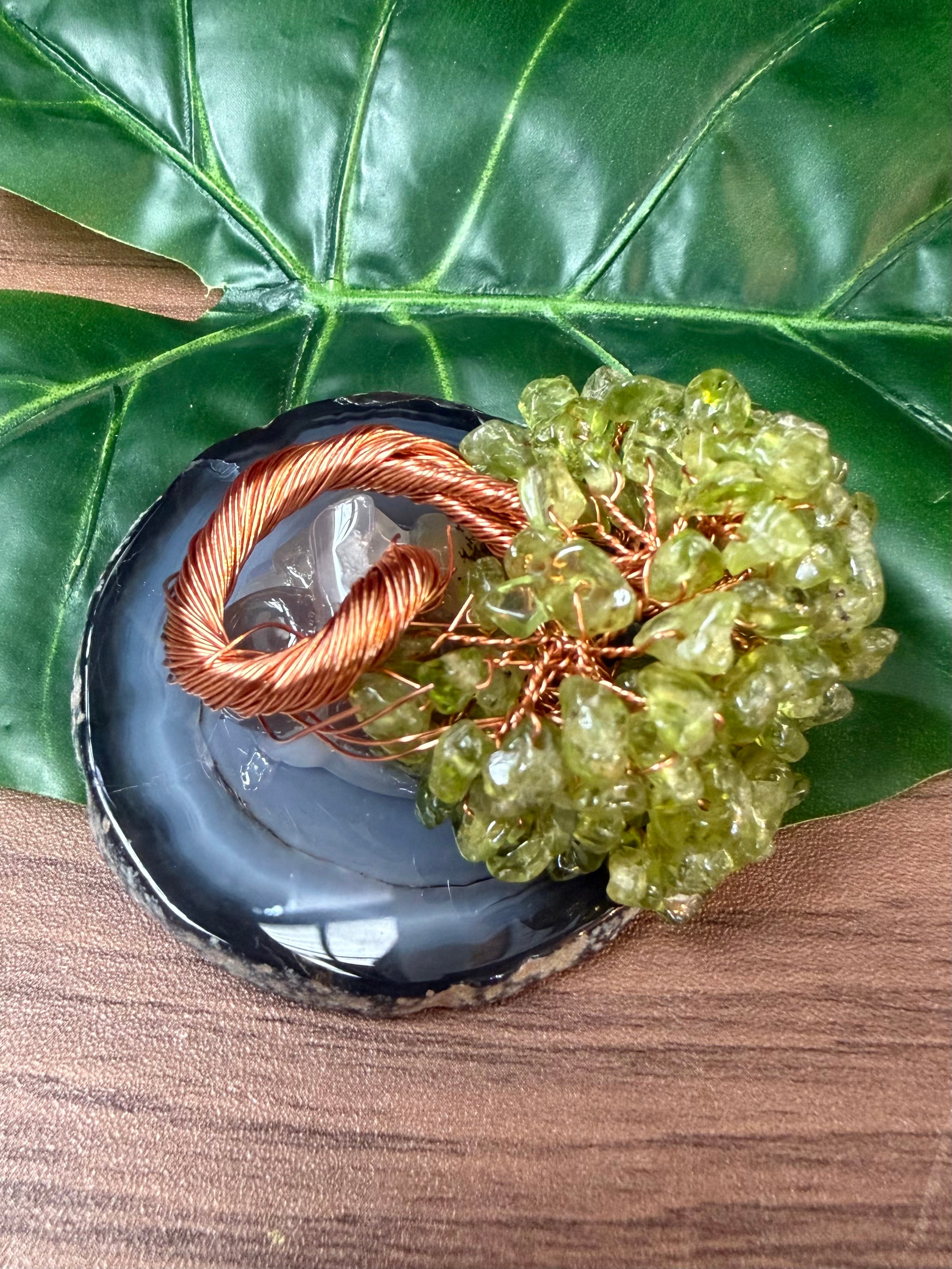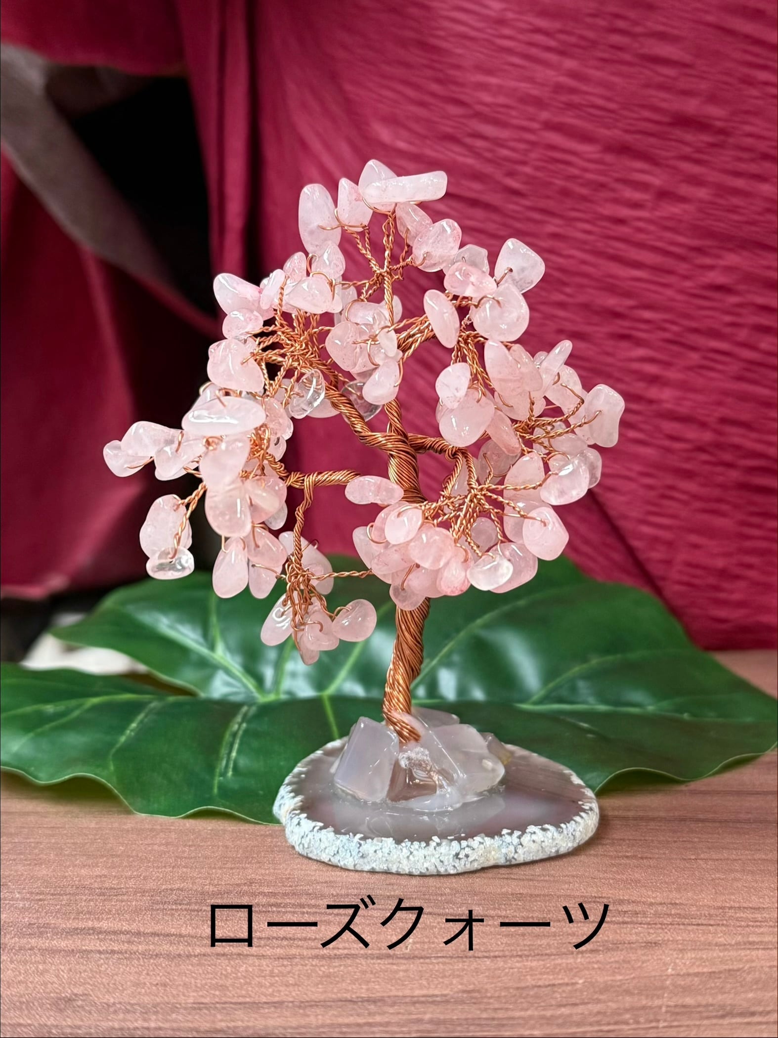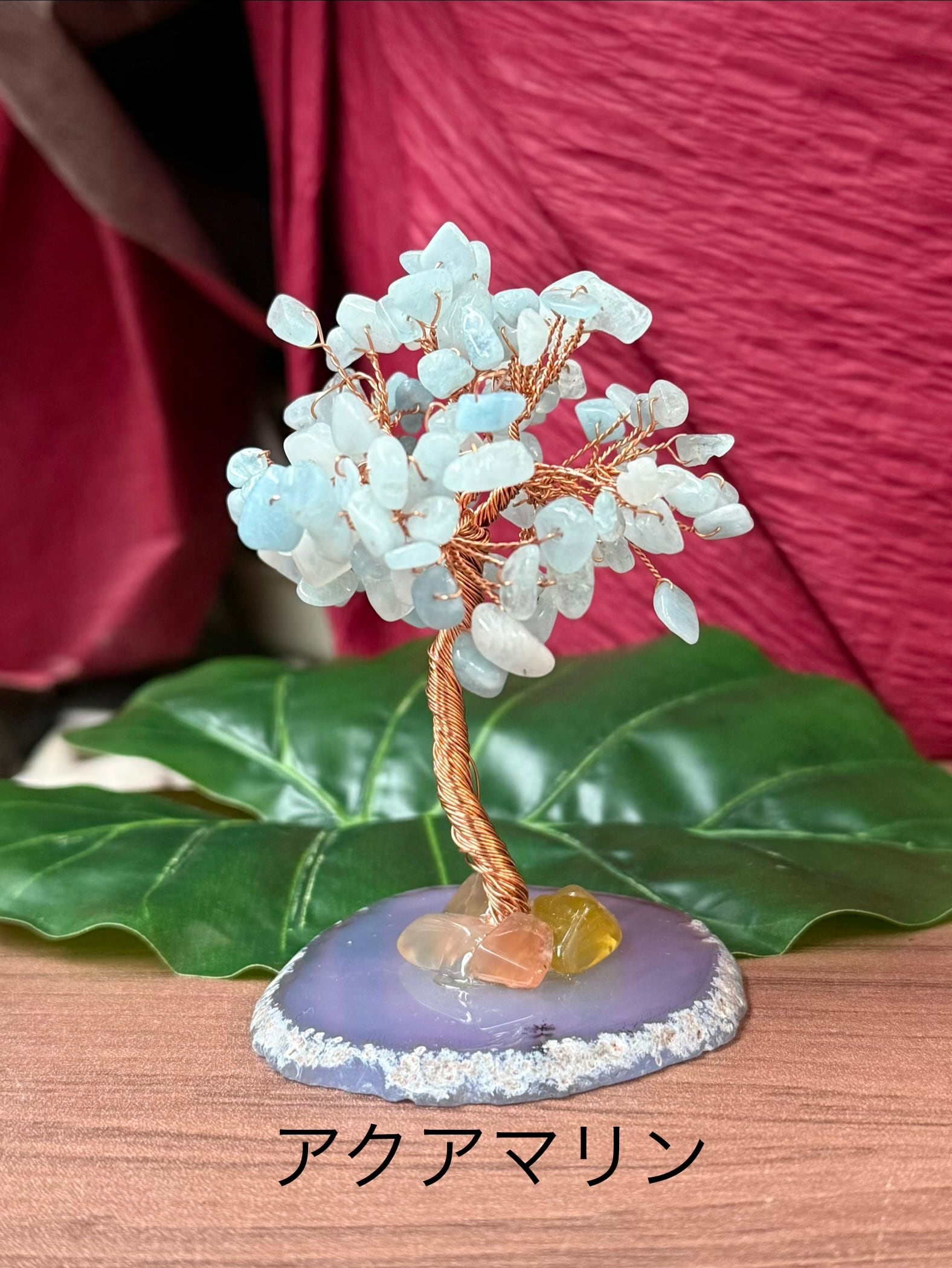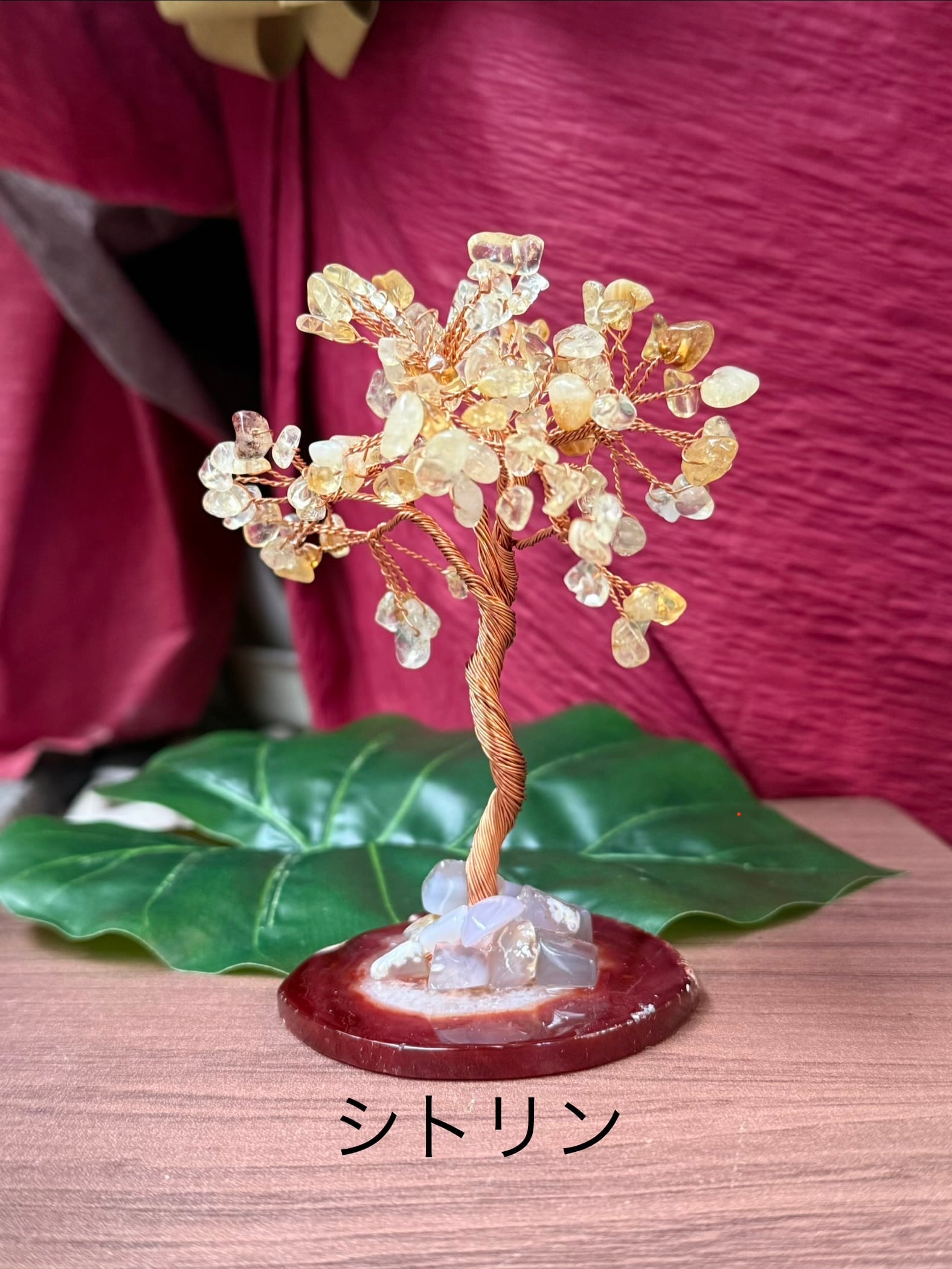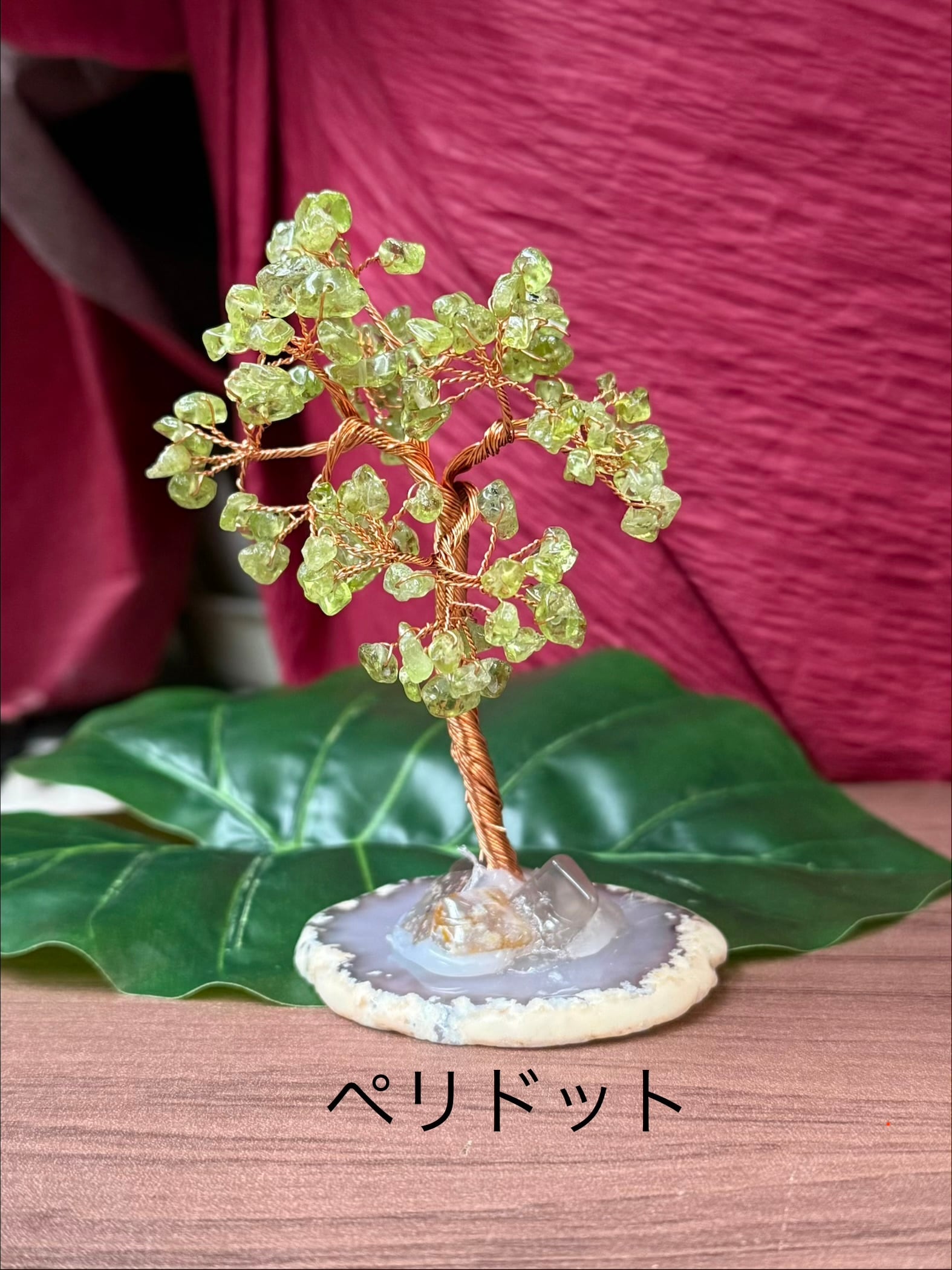 スライスした瑪瑙(めのう)の土台に、さざれ石を針金で木の葉に見立てた縁起置物です。