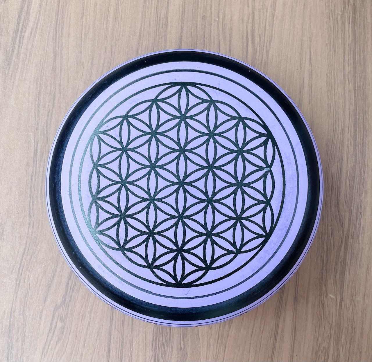 フラワーオブライフが描かれたチベタン・シンギングボウル、スティック2本、クッション台座がセットになっています。