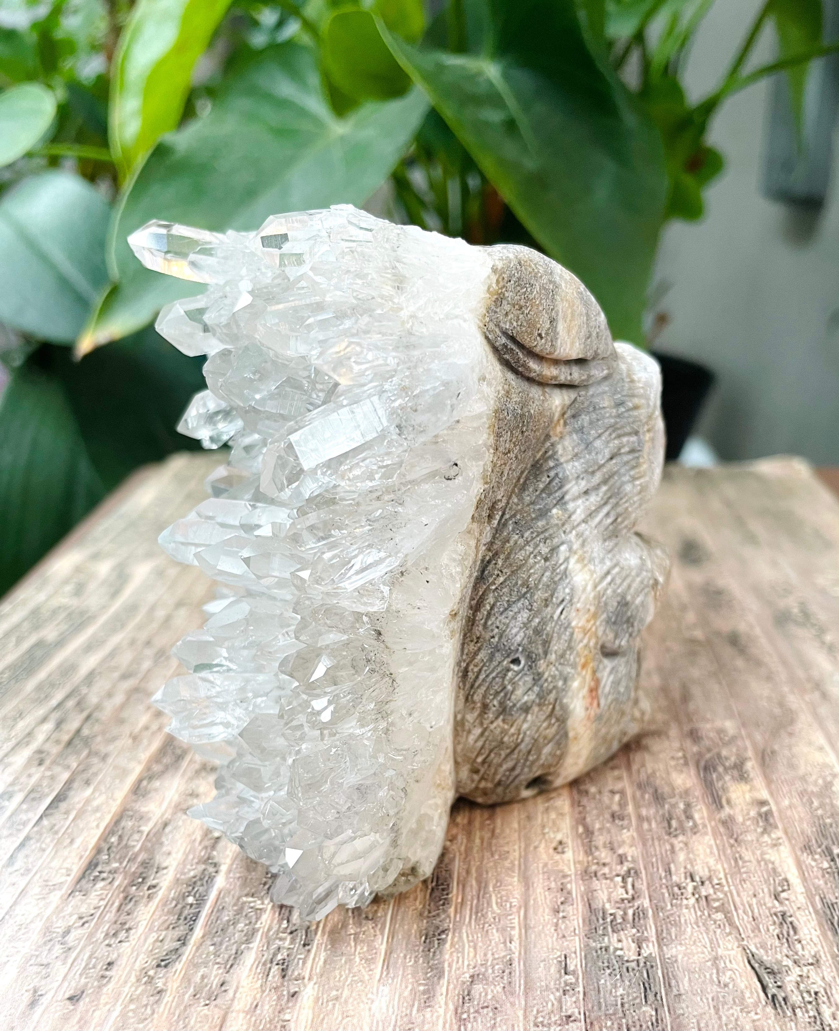 背面が透明度の高い水晶のクラスターになっている、珍しいうさぎの彫刻置物です。