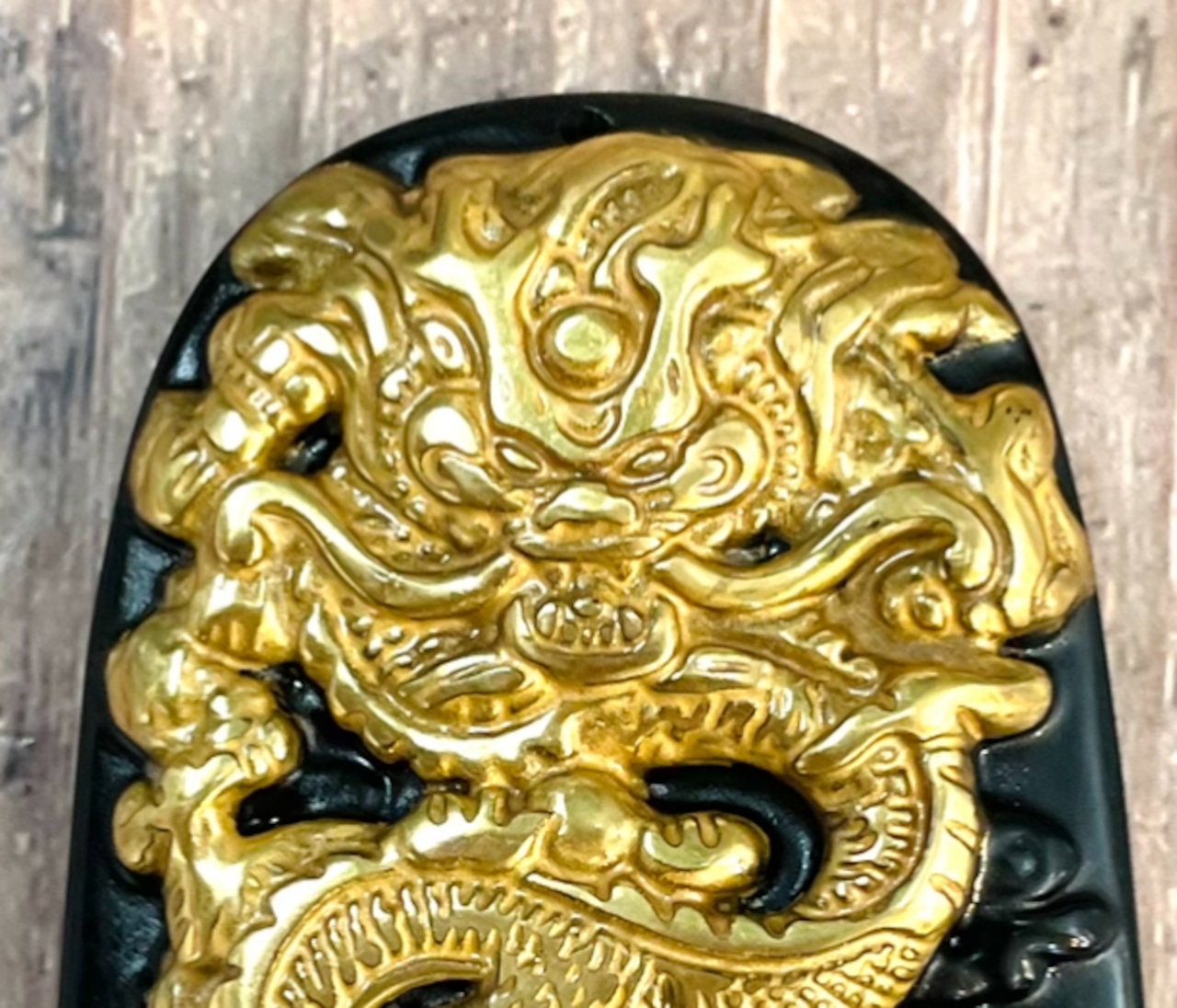 黄金龍が彫られたオブシディアン(黒曜石、天然ガラス質)プレートです。