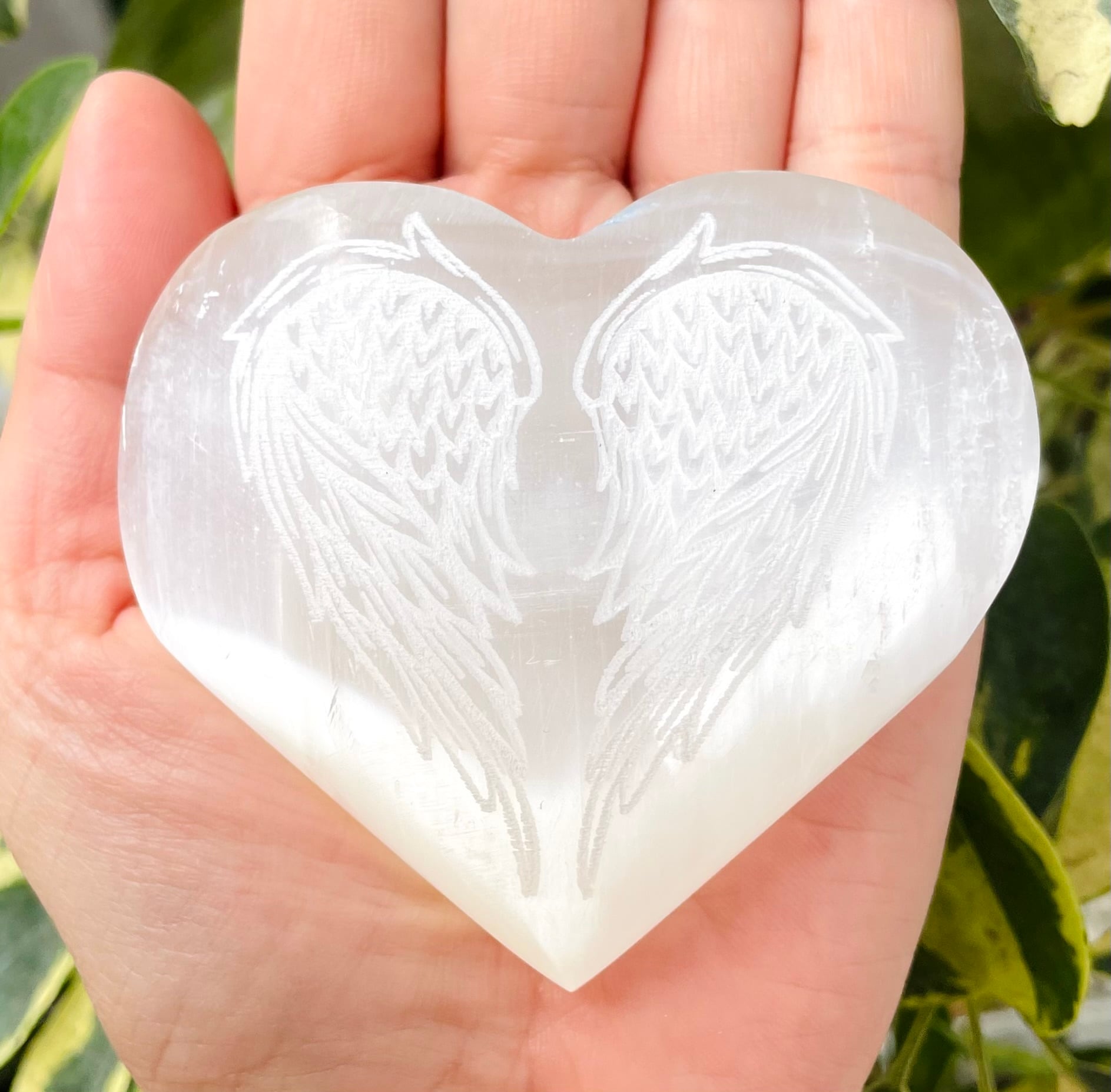 強力な浄化や癒し効果を持つ「セレナイト」にエンジェルの羽が描かれたハート型のタンブルです。