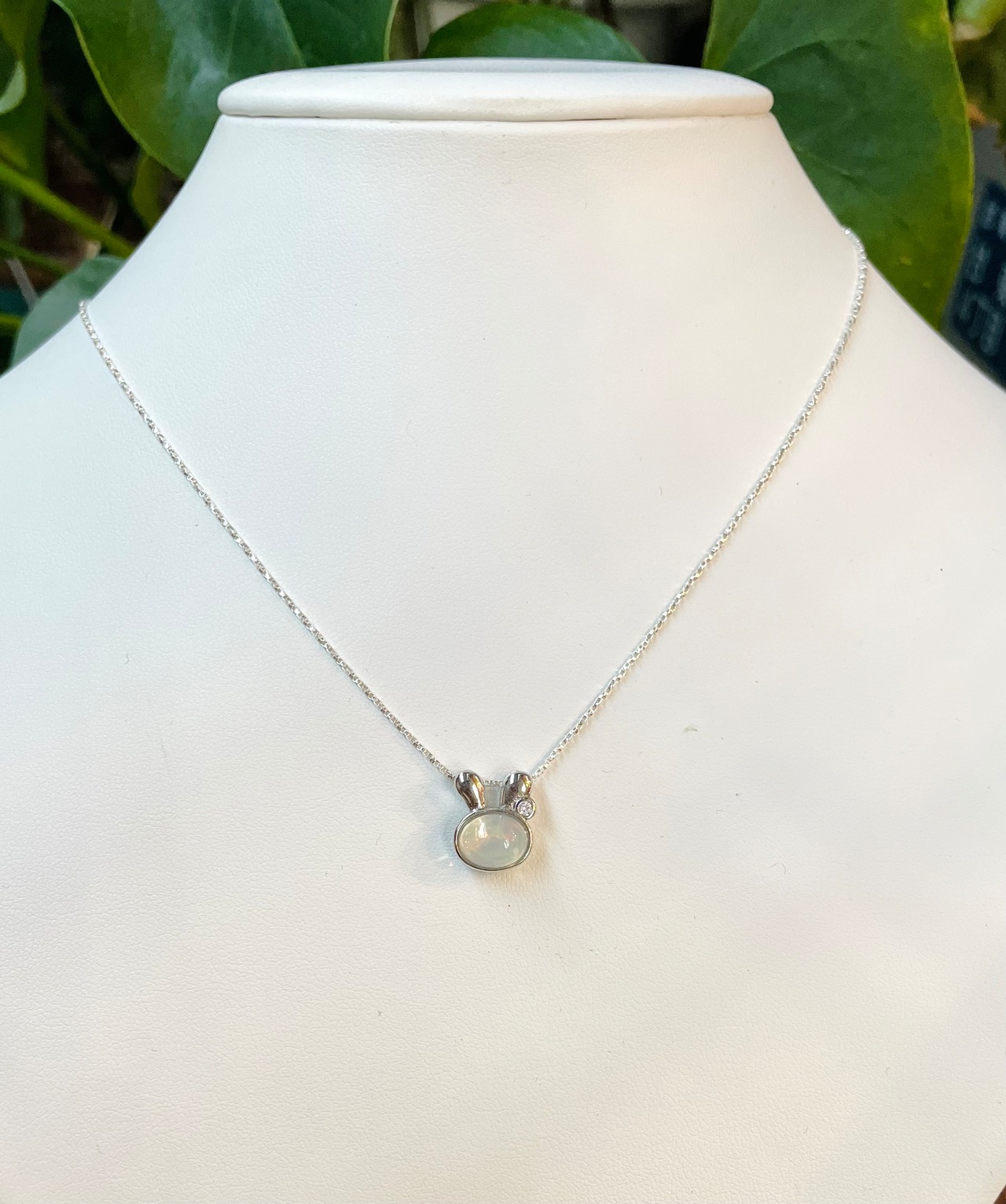 小さいながらも遊色効果と呼ばれる、虹のように七色に光る、とても美しいプレシャスオパールのうさぎモチーフペンダントトップです。
