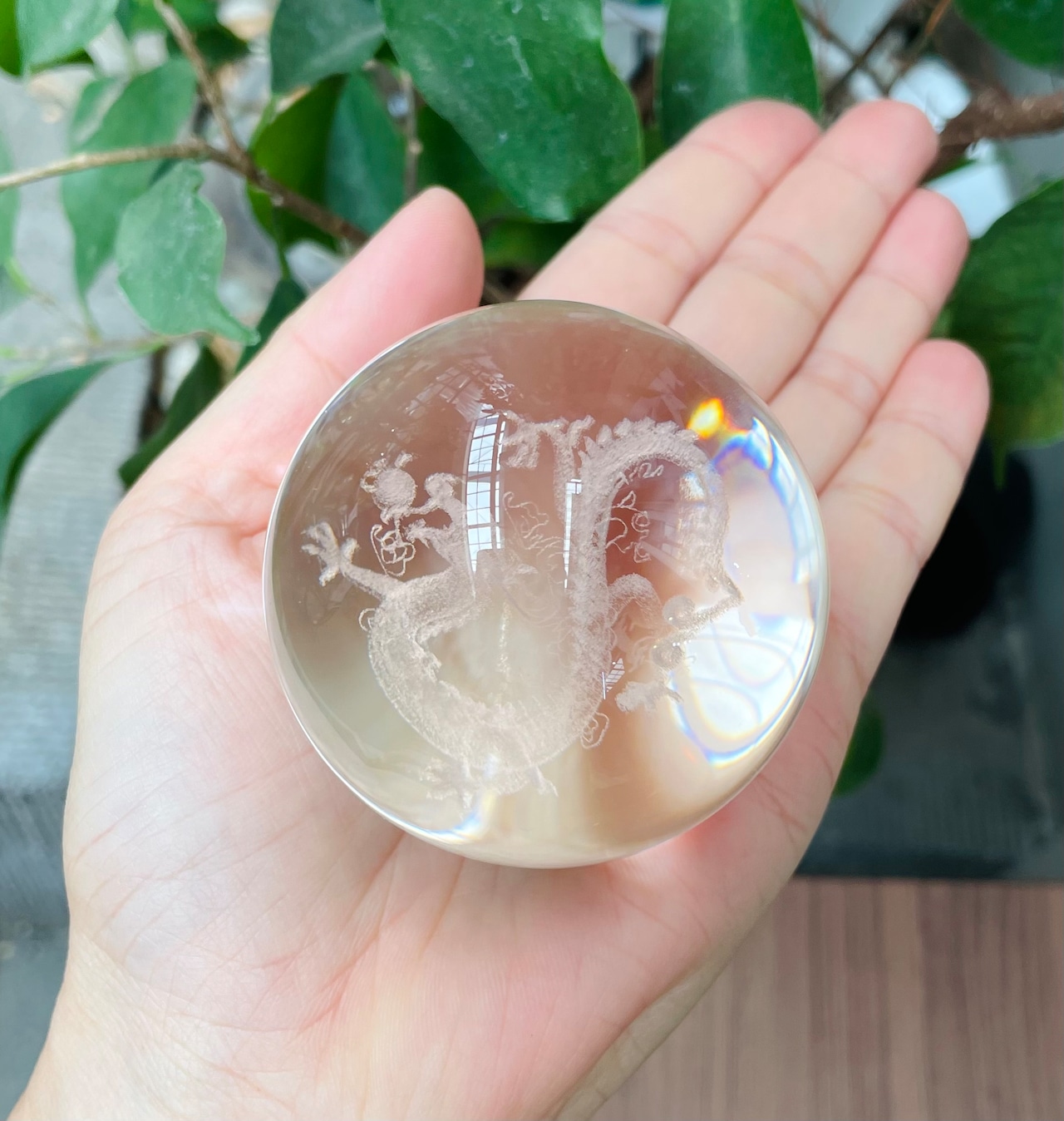 クリスタルガラスの丸玉にレーザーで龍彫が施されています。