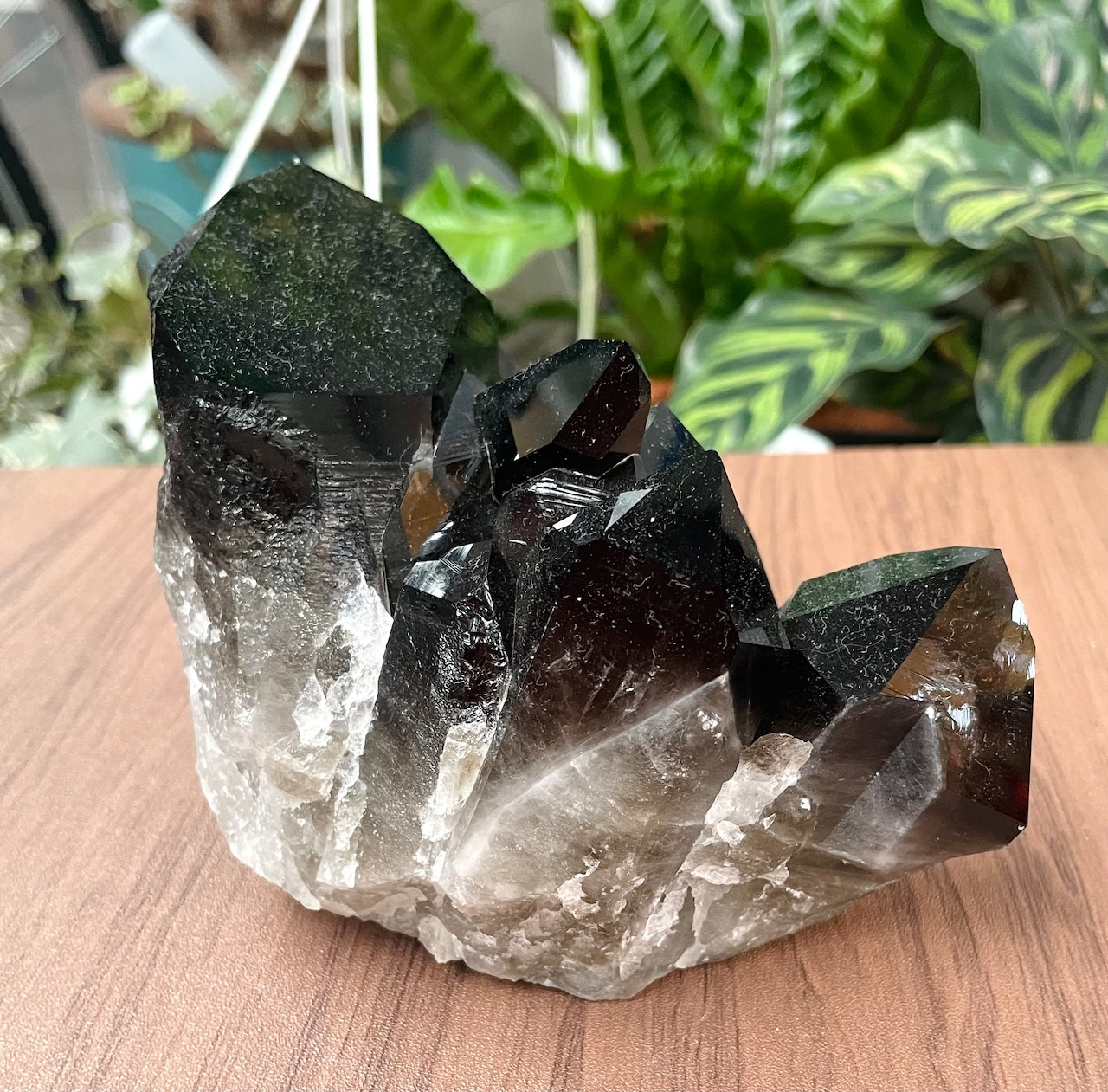 吸い込まれそうな漆黒色の良質なモリオンのクラスターです。