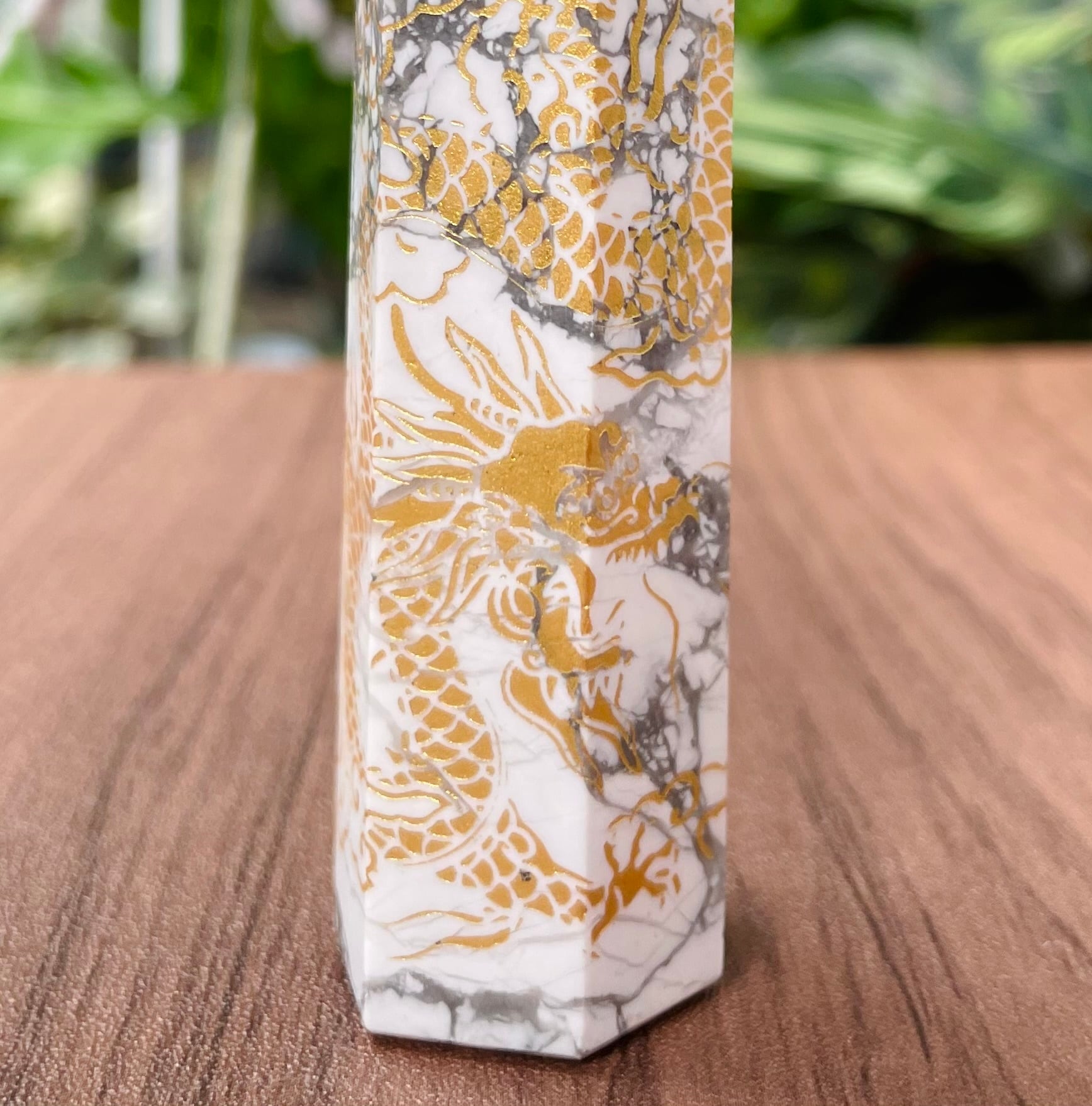 大理石のような白いマーブル模様が美しいハウライトのポイントに五本爪金龍が彫られています。(在庫よりランダムでお送りしますので、写真とマーブル模様が若干異なります)