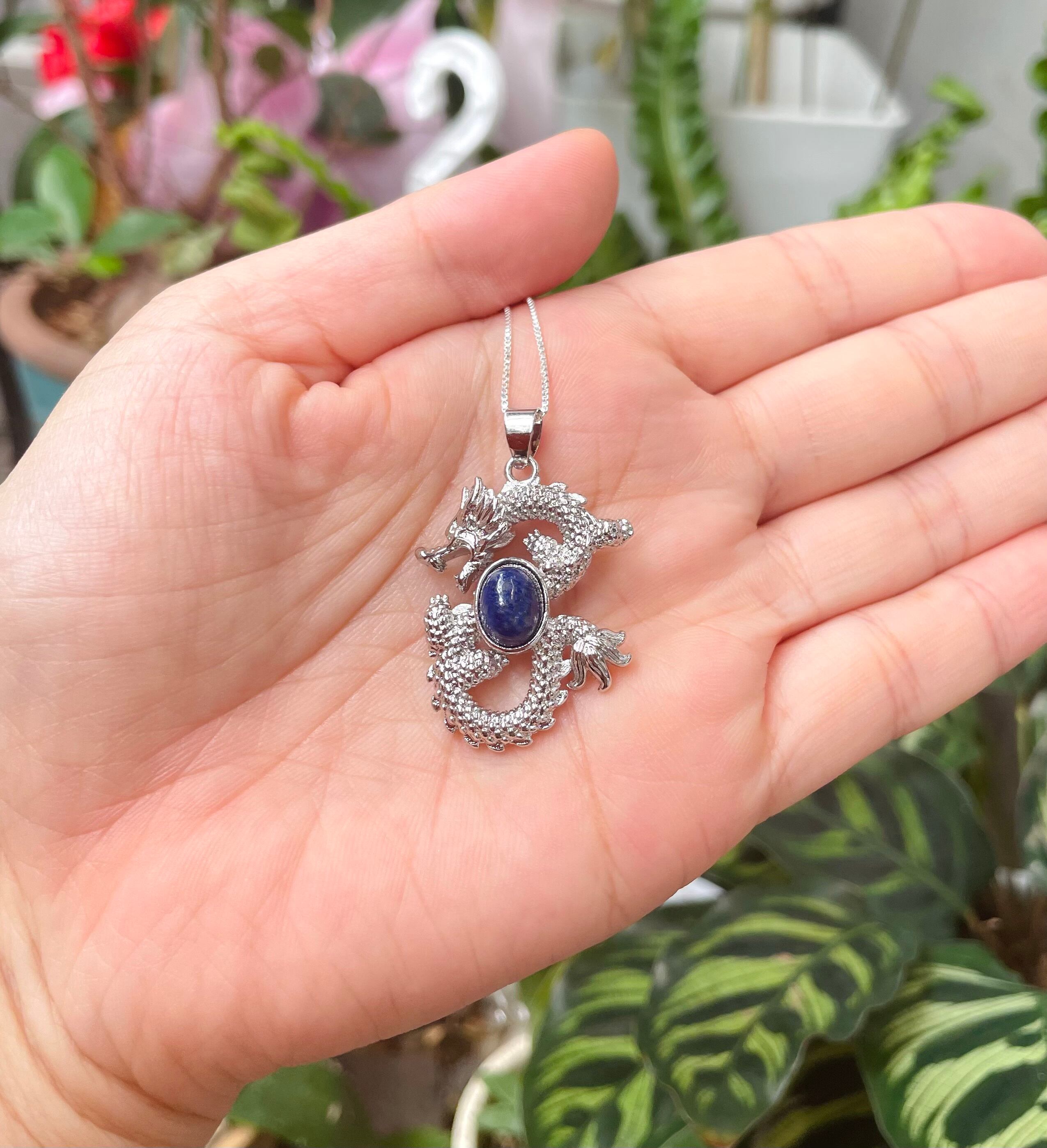 漆黒の石に光を当てると美しいキャッツアイ効果が見られるのが特徴のハイパーシーン、濃い鮮やかなブルーが美しいラピスラズリが付いている龍のペンダントトップです。